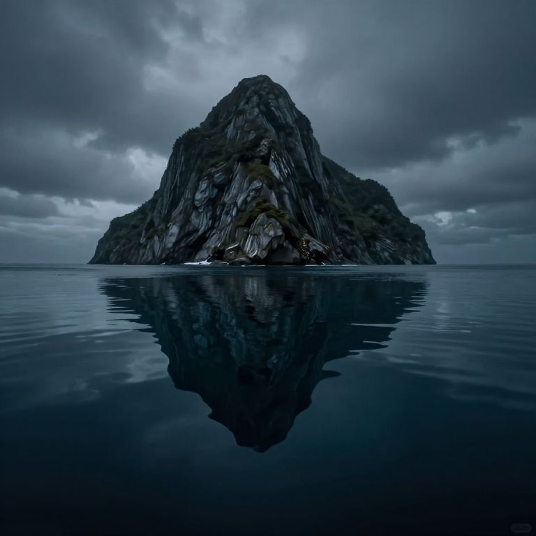 Emerging from the depths of the ocean, the mountainous island stands as a silent sentinel, its mirrored reflection beneath the surface hinting at hidden worlds and untold stories, evoking a profound sense of mystery and introspection.