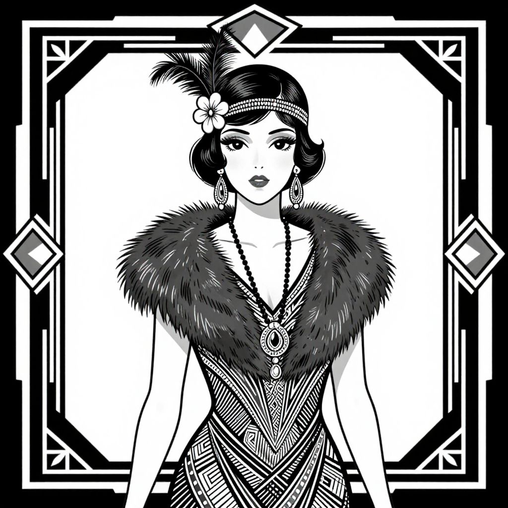 The image is a black and white illustration of a flapper from the 1920s, depicted in a cartoon style. The woman is elegantly dressed in a flapper dress adorned with intricate patterns and a fur collar, complemented by a headband featuring feathers and a floral accessory. She wears large, ornate earrings and a necklace with a detailed pendant. The background is a geometric, Art Deco-inspired design with a rectangular frame and decorative elements, adding to the vintage aesthetic. The overall composition is balanced, with the woman centrally positioned and the decorative elements framing her elegantly.