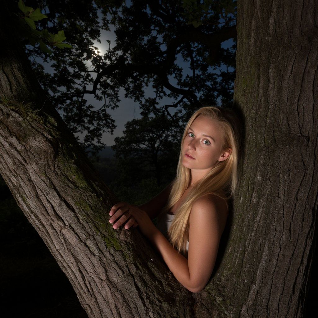 Photograph of a blonde woman with fair skin and blue eyes, partially hidden behind a large, dark tree trunk at night. She has long, straight hair and is wearing a white tank top. Her right arm is wrapped around the tree, and her hands rest on a thick branch. The background is dark with silhouetted tree leaves and a visible moon. The lighting highlights her face and upper body, creating a contrast with the dark surroundings. The texture of the tree bark is rough and detailed.