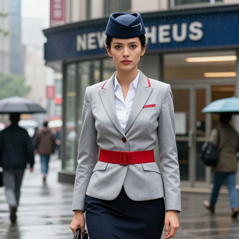 A confident female journalist in her classic journalist outfit—light gray suit with a red sash, dark trousers, and a structured hat—standing outside a news bureau in a bustling city street, with sunlight filtering through the rain, her face determined and professional, high-resolution photography