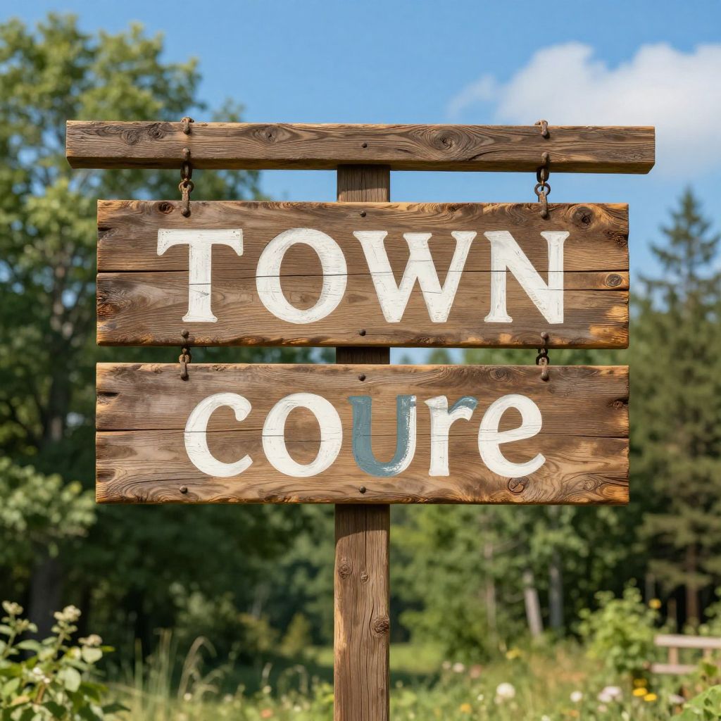 Town sign generator creating vintage wooden signs with rustic textures and hand-painted letters, set against a lush forest backdrop under a bright blue sky, perfect for quaint village entrances in a cozy, charming style.