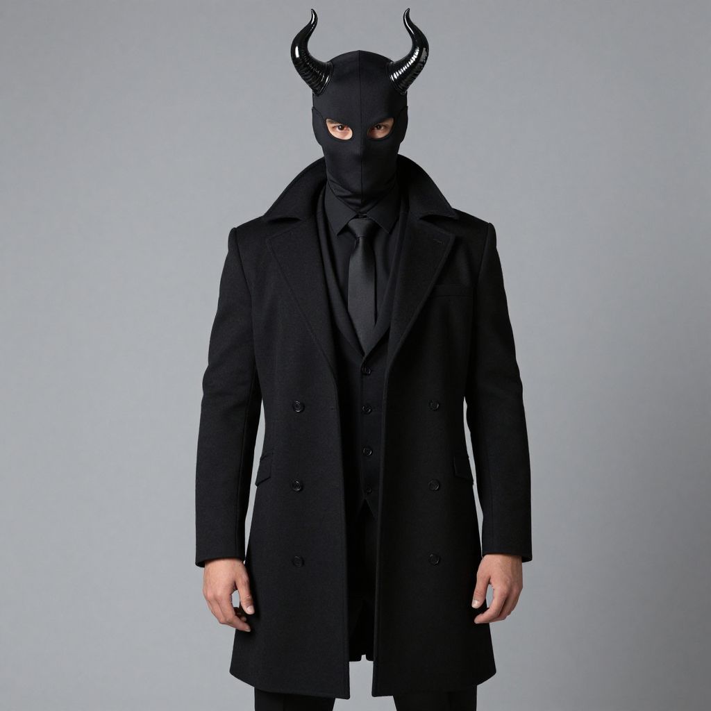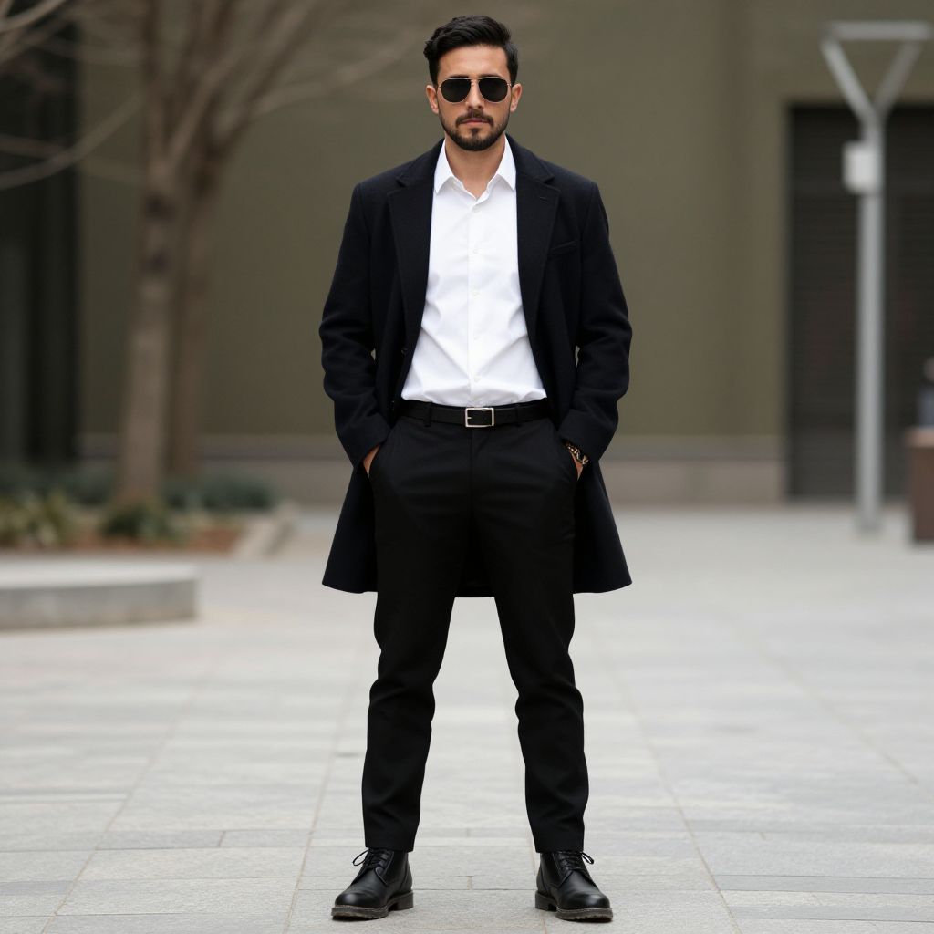 Photograph of a person in black formal attire, including a blazer, black pants, leather gloves, belt, and polished shoes, standing on wooden
