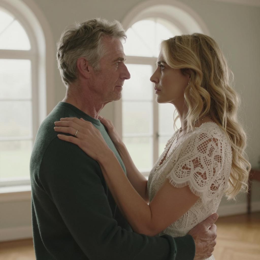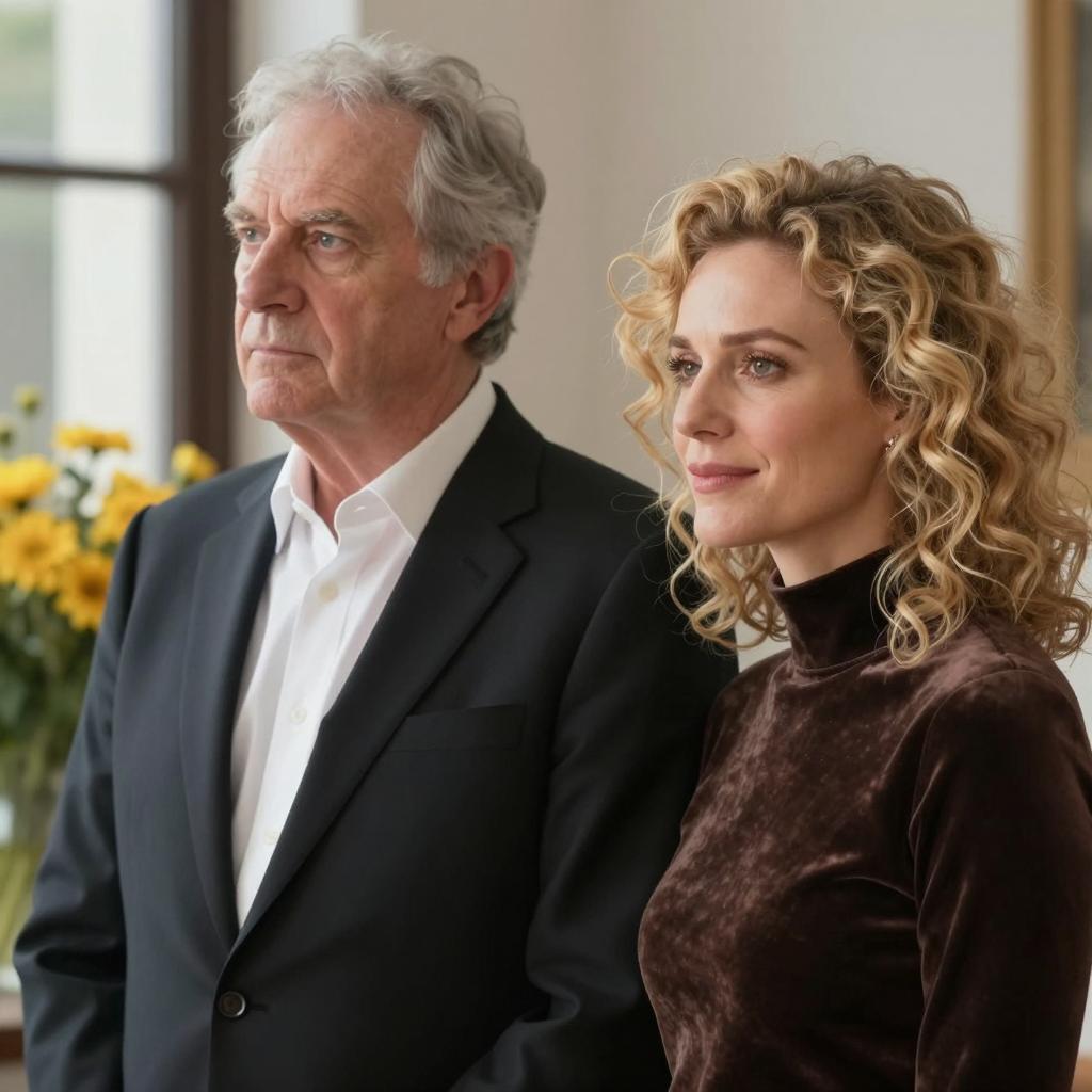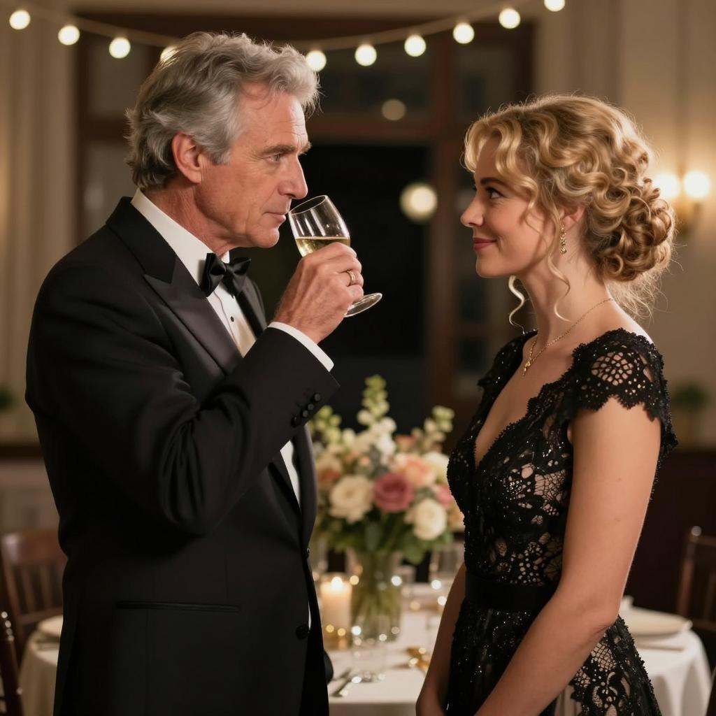 A man and woman in a dimly lit room with a background of hanging string lights. The man, with gray hair and wearing a black tuxedo, holds a glass to his lips, looking at the woman. The woman, with curly blonde hair in an updo, wears a black lace dress with sheer sleeves. She looks at him with a slight smile. Both are standing close together, facing each other. There is a floral arrangement in the background. The man is on the left, the woman on the right.