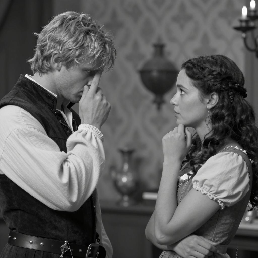 Black-and-white photograph depicting four people dressed in ornate 18th-century Baroque-style clothing. The central focus is a man and woman kissing on an elaborately carved wooden four-poster bed. To the left, a woman wearing a headband and similarly styled dress watches solemnly. To the right, an elderly man dressed in period attire holds a human skull on his lap, his expression intense and contemplative. The backdrop is a textured stone wall, enhancing the historical ambiance.