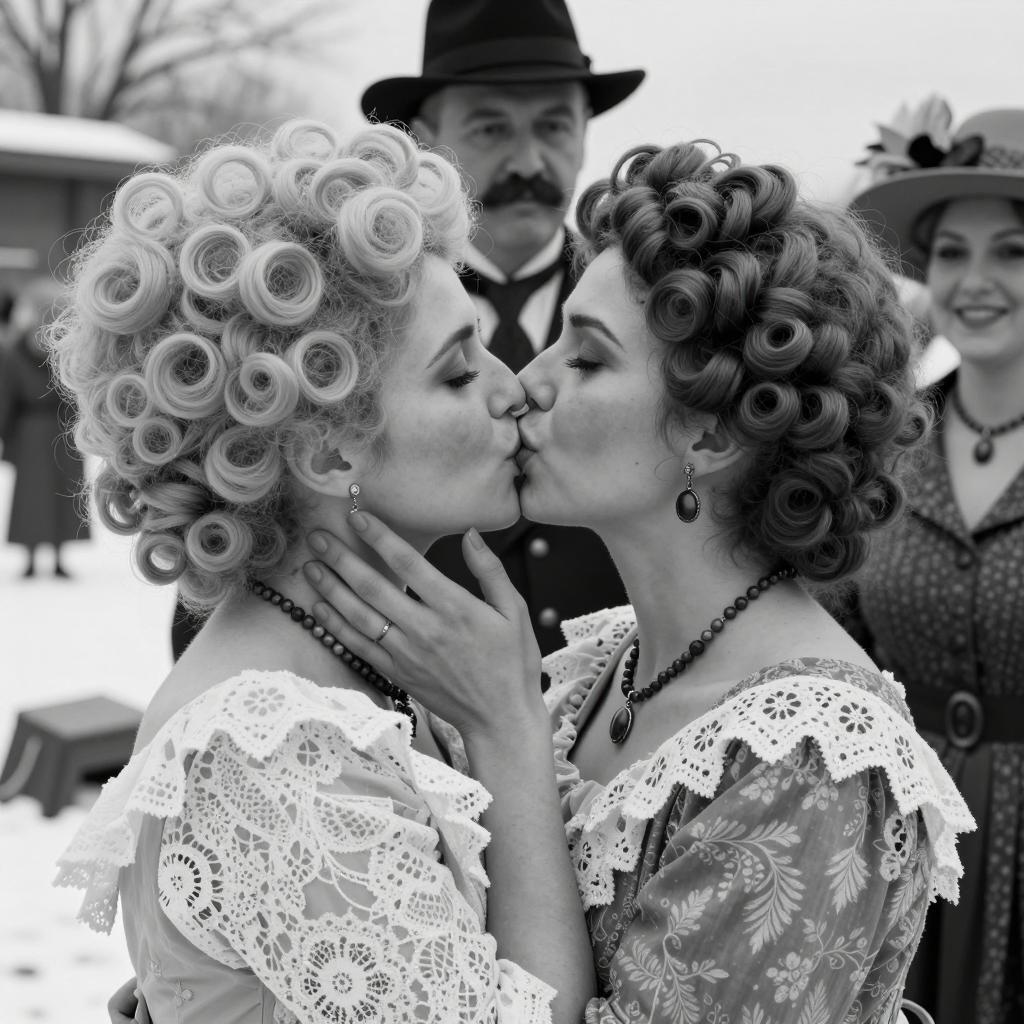 Black-and-white photograph of four people in ornate, 18th-century clothing. Man and woman kissing in center, another woman with headband in background, elderly man with skull on lap to right. Baroque-style bed with wooden posts, ured stone wall background. Intense, defined facial expressions.