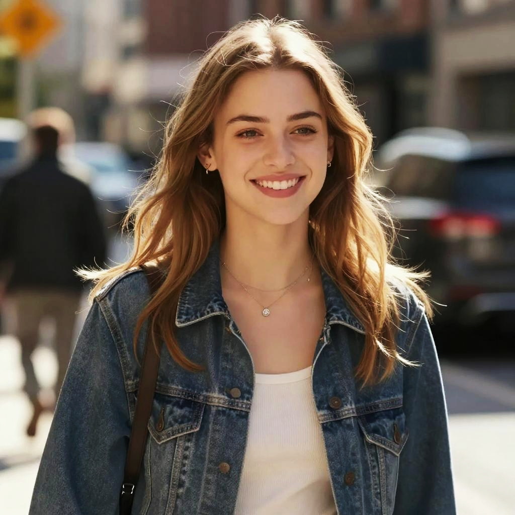 Photograph of a smiling young woman with wavy brown hair, wearing a blue denim jacket, white shirt, and white-striped skirt, standing outdoors on