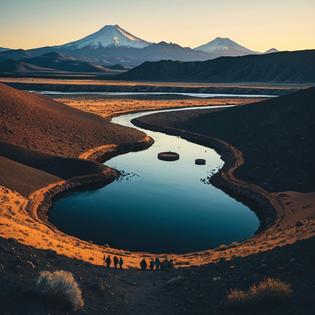 Silhouette of hot air balloonists in a donut-shaped panoramic landscape, with a hollow center and retro-style print of Central Oregon mountains at sunset, inspired by Henri Rousseau. Features vintage dull blue and warm sunset tones, minimalist lines and bold blocks of color, snow-capped peaks, and a winding river.