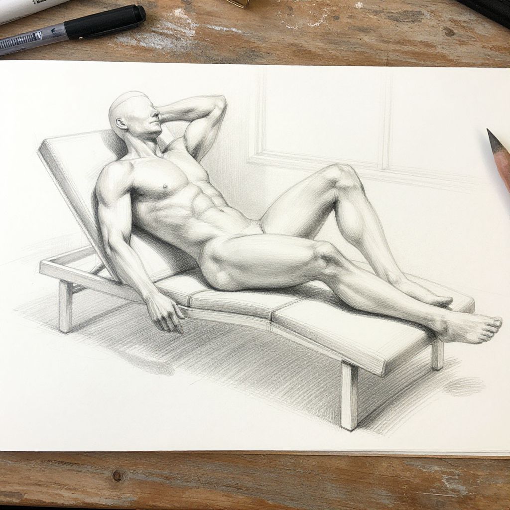 Figure sketch model in a relaxed reclining pose on a simple chaise lounge, subtle shading illustrating muscle curvature, soft early morning light streaming through large windows, artist tools close by on a weathered wooden table, pastel tones with hints of graphite textures