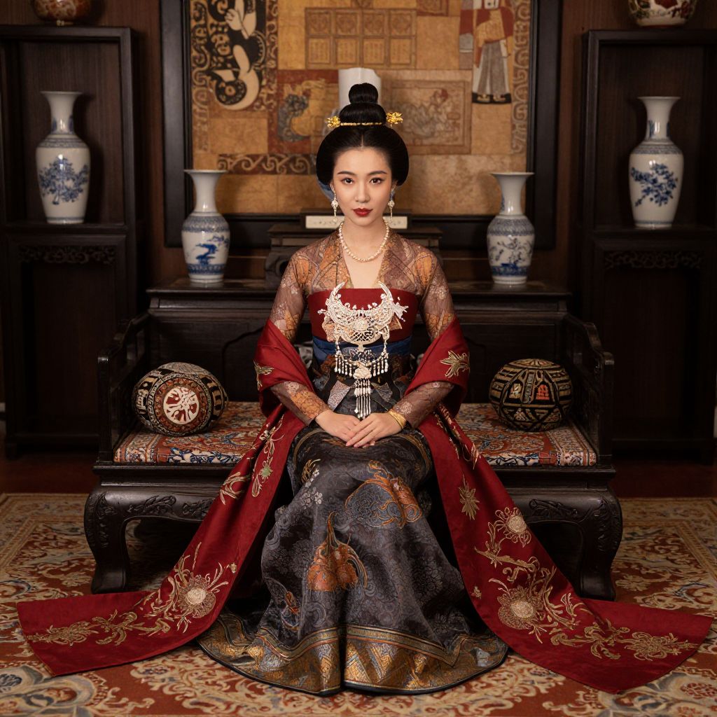 Photograph of an East Asian woman with fair skin and dark hair in an elaborate traditional Chinese qipao dress. She sits on a dark wooden bench adorned with intricate carvings, in front of a traditional Chinese wall painting. Her dress is black with gold and red floral patterns, and a red silk robe with gold embroidery is draped over her shoulders. She wears a black hair bun decorated with gold ornaments, and her makeup includes red lipstick and delicate eye makeup. Two blue-and-white porcelain vases and a decorative round object are on either side of the bench. The floor features an ornate red and gold patterned rug.