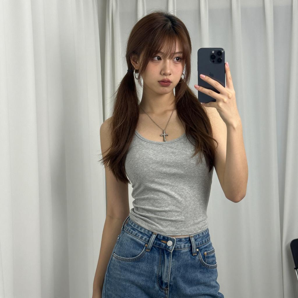 Young woman with long brown hair in pigtails, wearing a tight gray tank top and blue high-waisted jeans, taking a mirror selfie with an iPhone. She has a nose ring, hoop earrings, and a cross necklace. White curtains in the background. Her expression is neutral. Her right hand holds the phone, her left arm slightly raised.