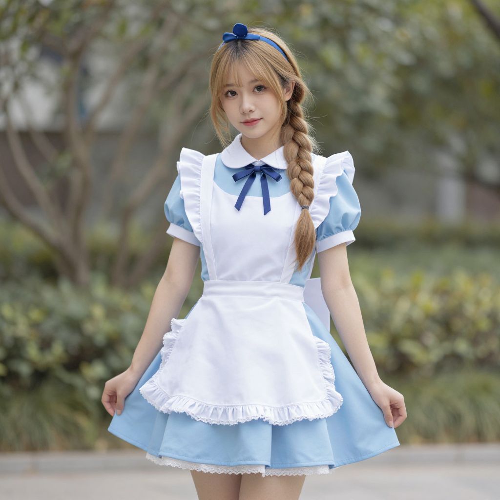 Photograph of an Asian woman with light brown hair in a braid, wearing a blue and white Alice in Wonderland-style maid dress, blue ribbon bow
