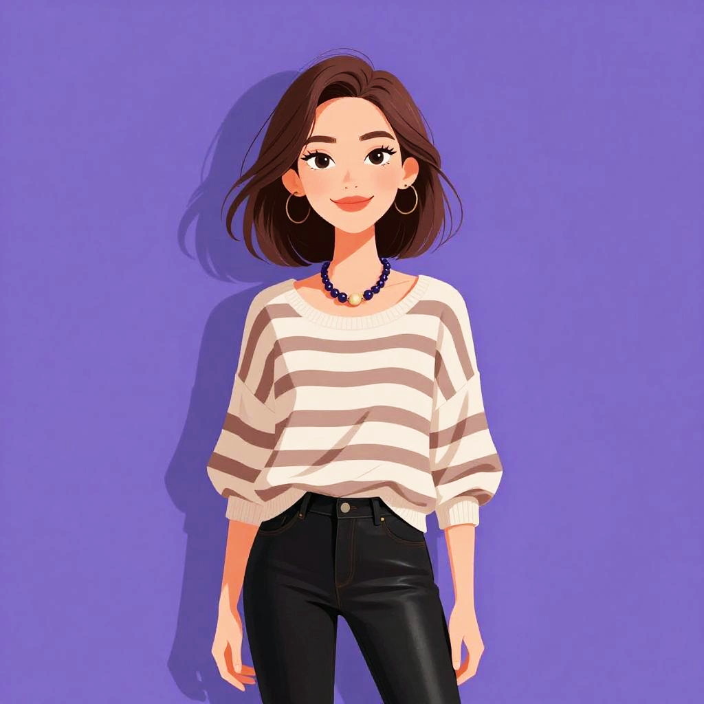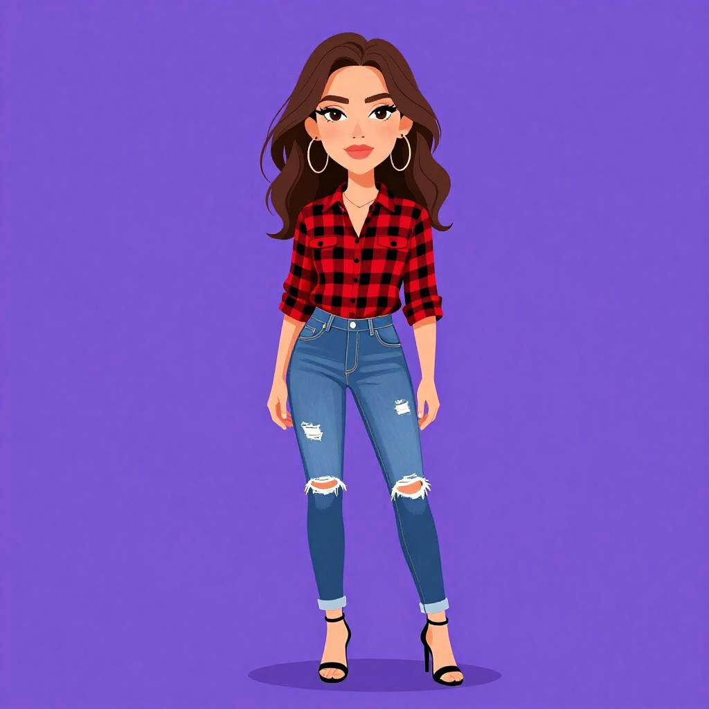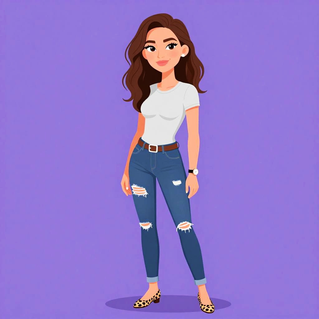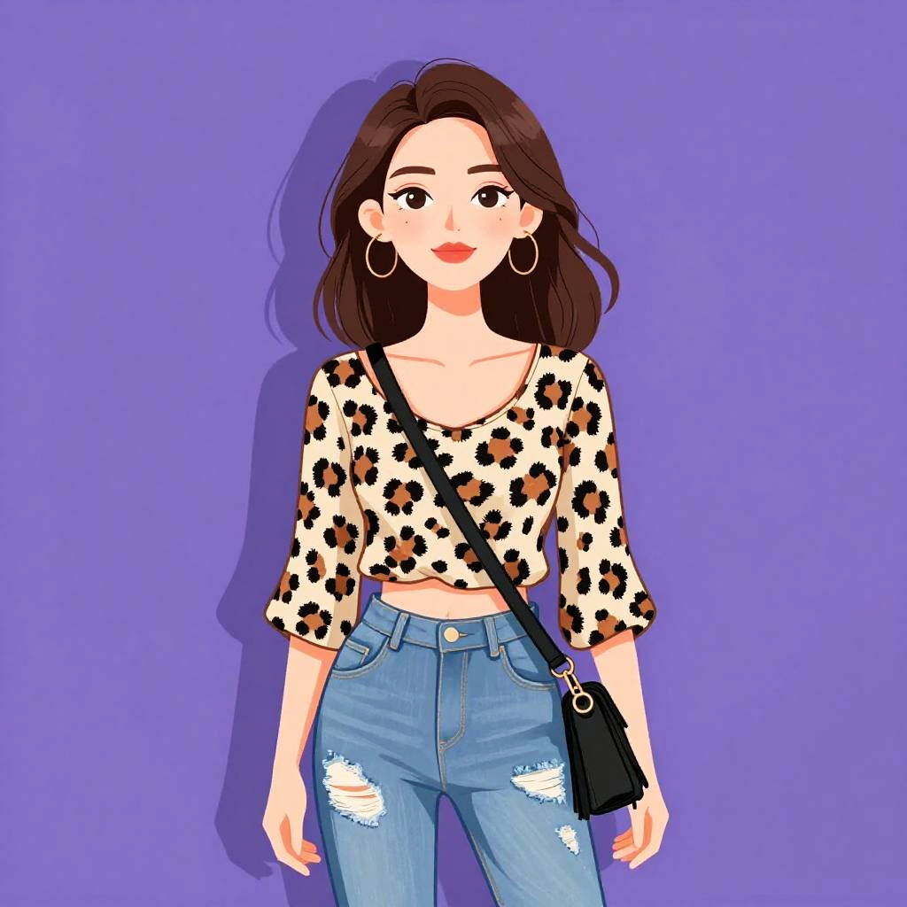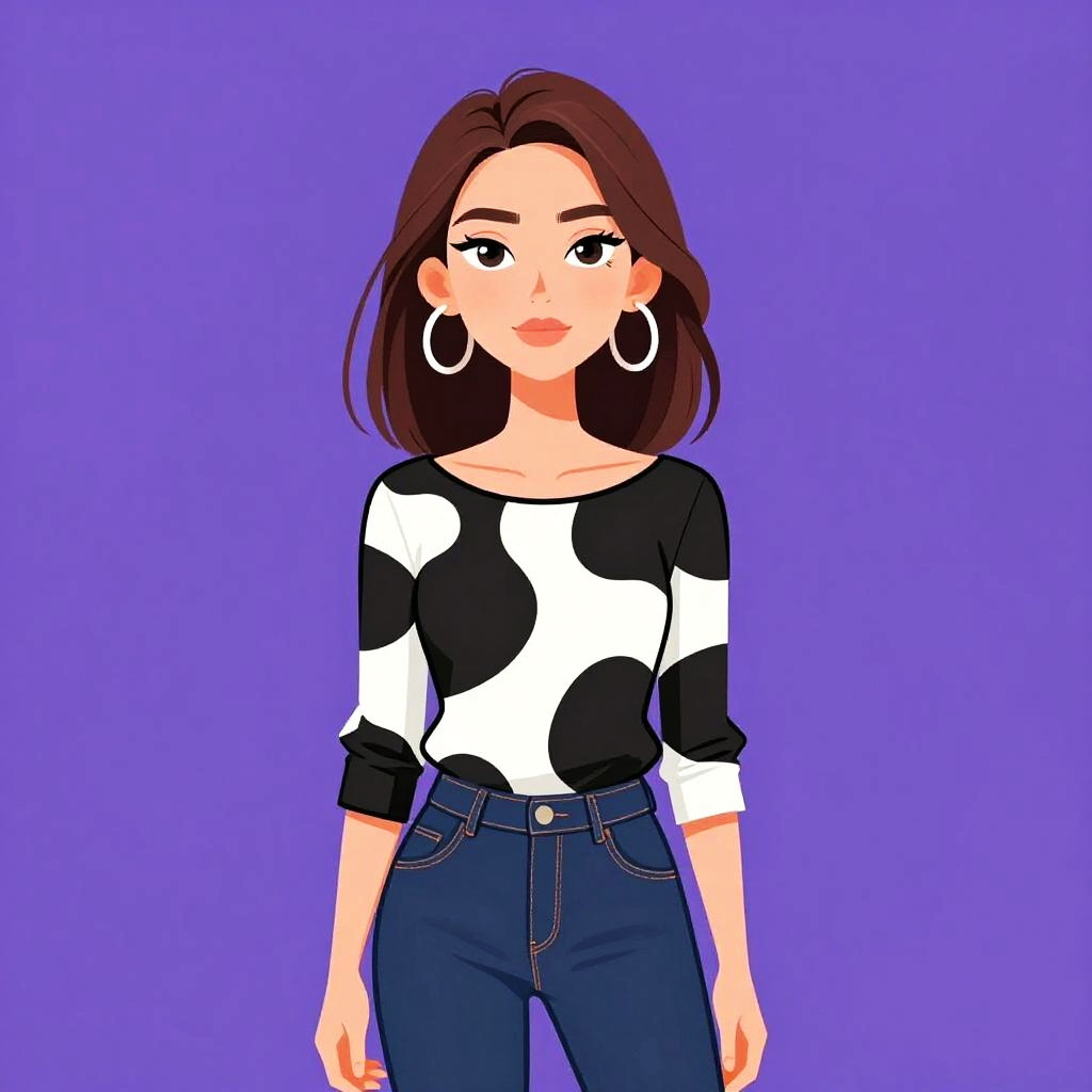 Illustration of a young woman with shoulder-length brown hair and large hoop earrings, wearing a black and white abstract printed top with a boat neckline and three-quarter sleeves, tucked into dark blue skinny jeans. The background is solid purple.