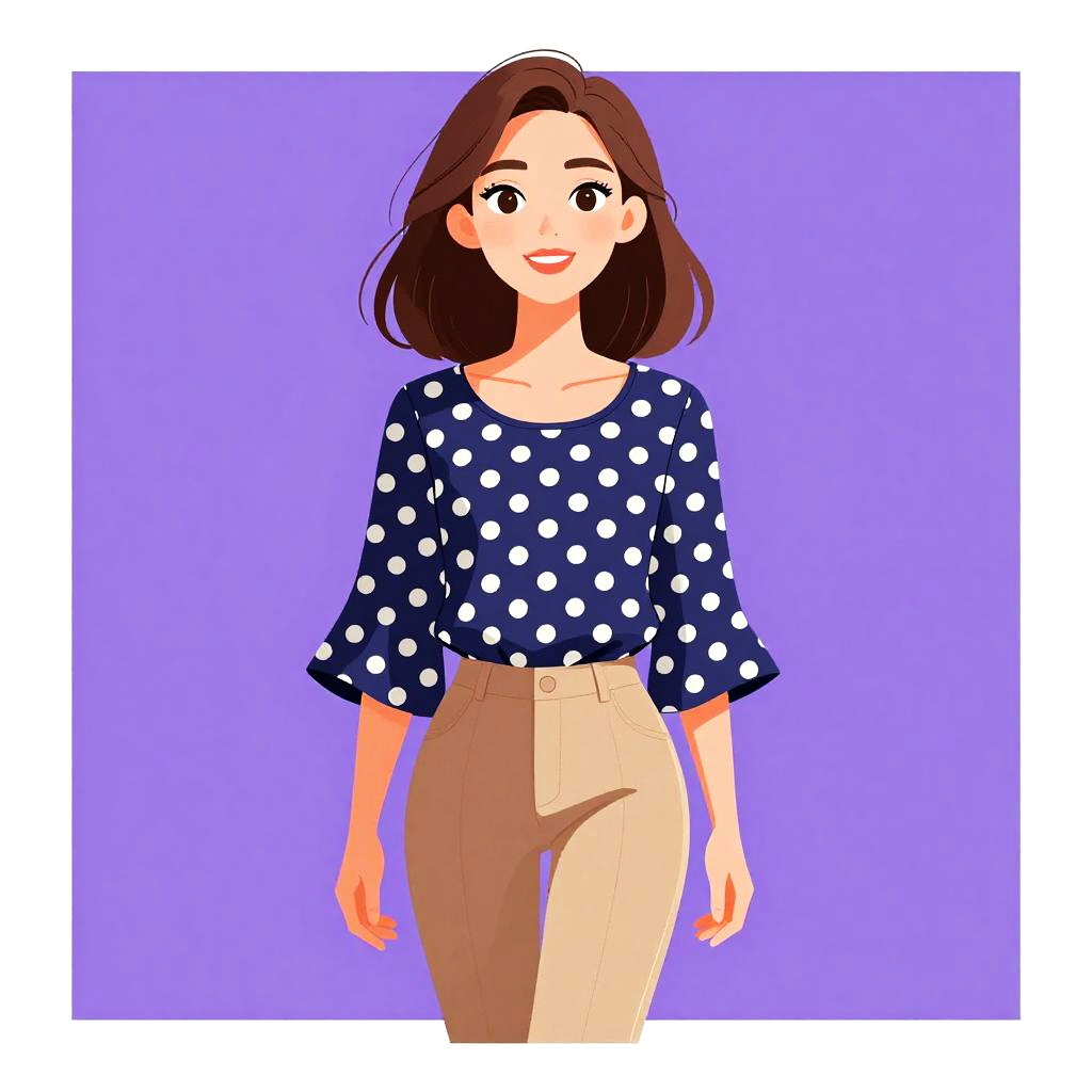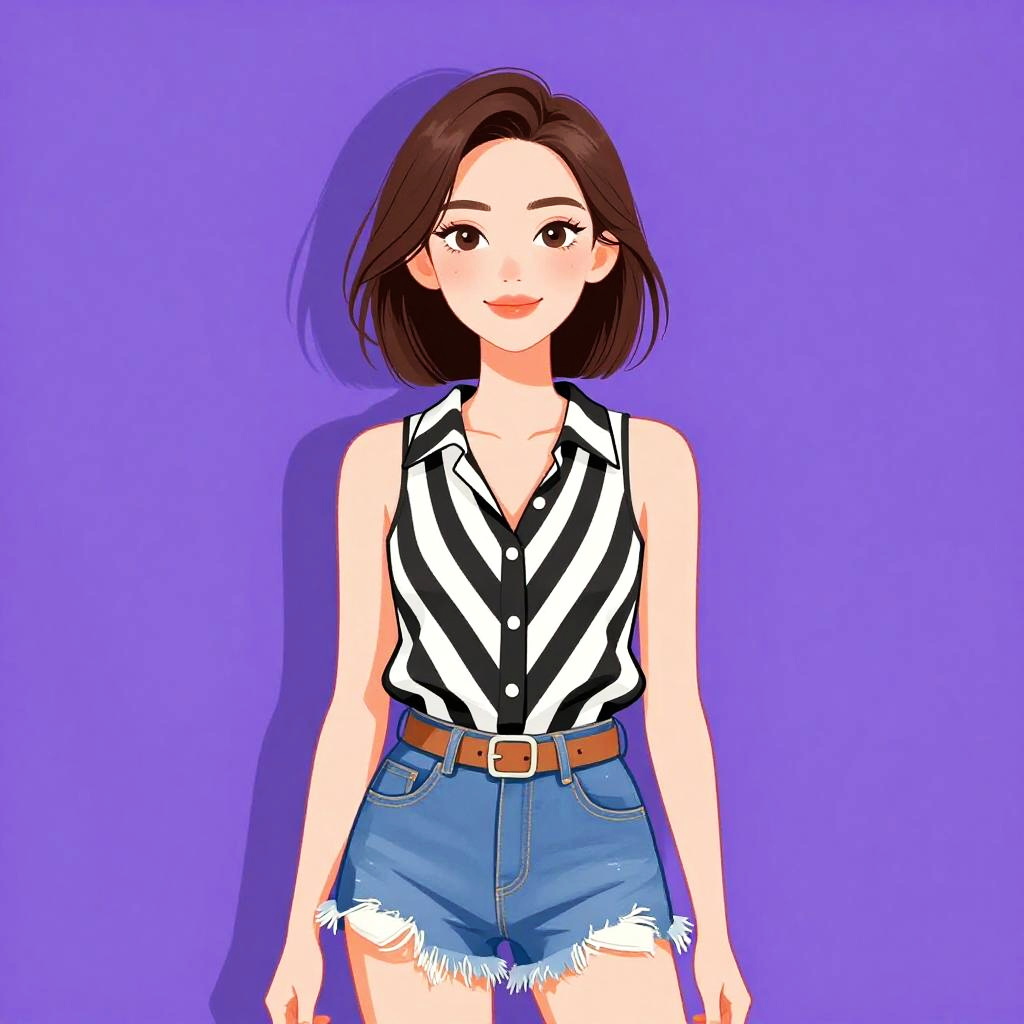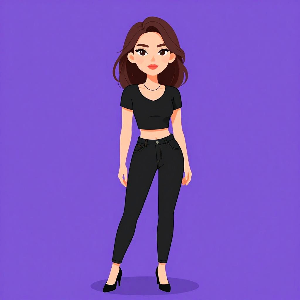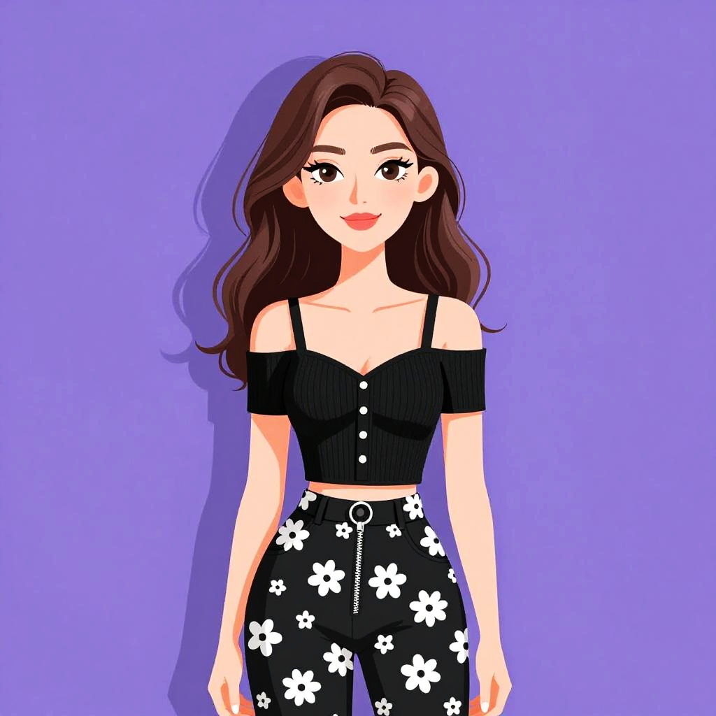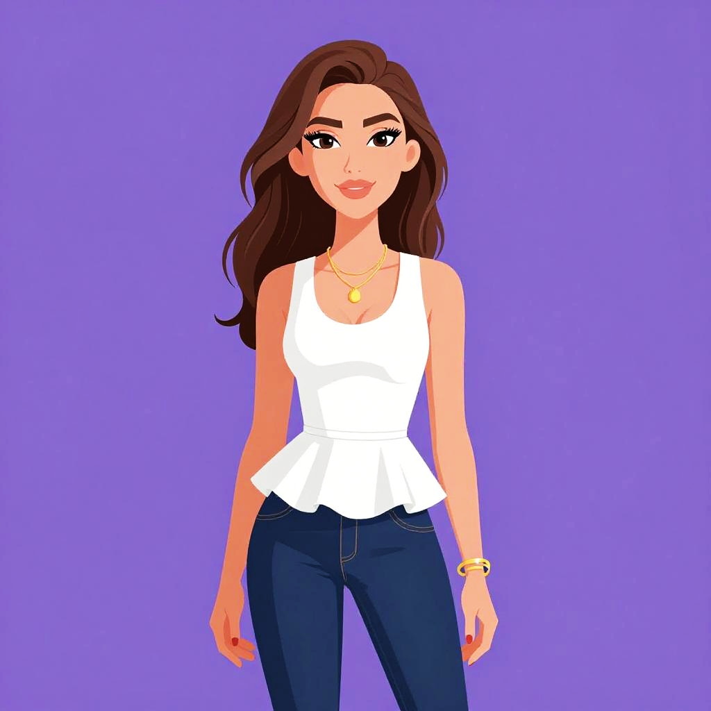 Illustration of a young woman with shoulder-length brown hair and large hoop earrings, wearing a black and white abstract printed top with a boat neckline and three-quarter sleeves, tucked into dark blue skinny jeans. The background is solid purple.