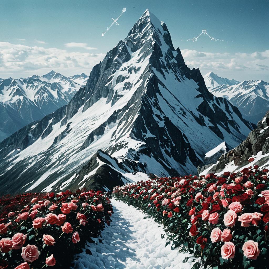 Bleed A fantastical, hyper-detailed scene of a lush, enchanted mountain peak teeming with snow petaled roses. whispering wind runes guide the viewer’s gaze along a crystal ridge, all realized in a magical, surreal composition.