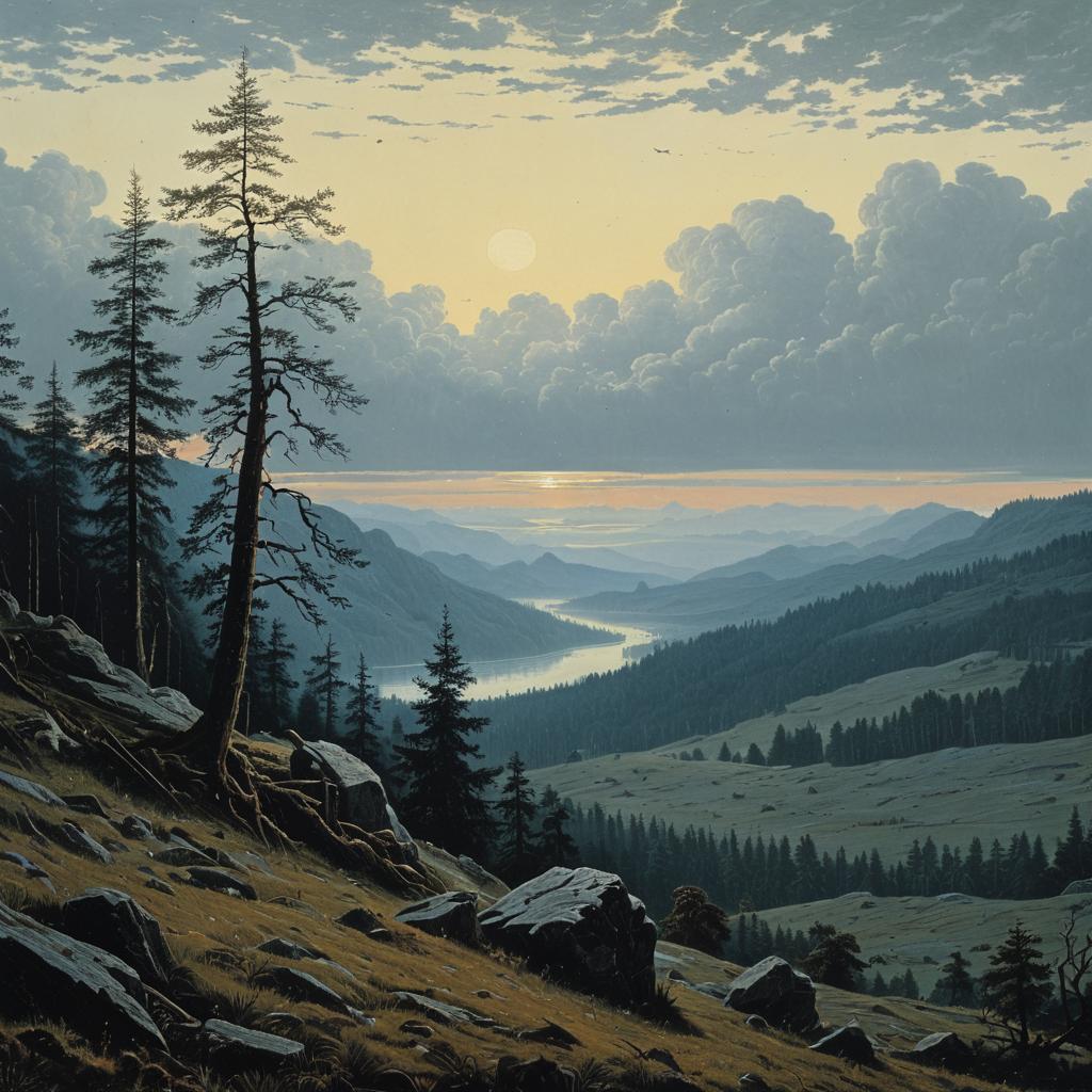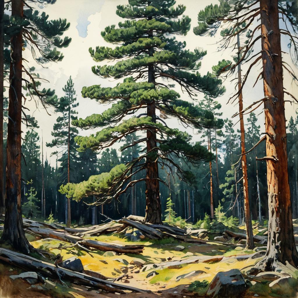 Watercolor painting of ancient pine tree in Norwegian fjords, art by Jean-Baptiste-Camille Corot, Ivan Shishkin, cinematic lighting and lush detail.