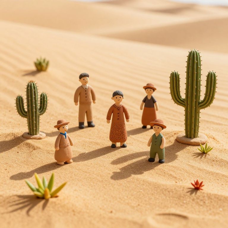 A surreal desert landscape where miniature, intricately crafted clay figures and cacti stand as if alive, casting long shadows across a sea of golden sand dotted with tiny, vibrant plants.