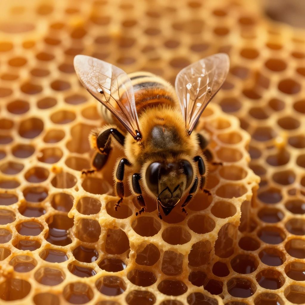 (4k), (masterpiece), (best quality), (extremely intricate), (realistic), (extremely detailed), photograph, stunning 3d rendering, realistic image and colors, full image shot, centralized "upper view", around each honeycomb side other similar contiguous unfocused, o ONE BEE on image