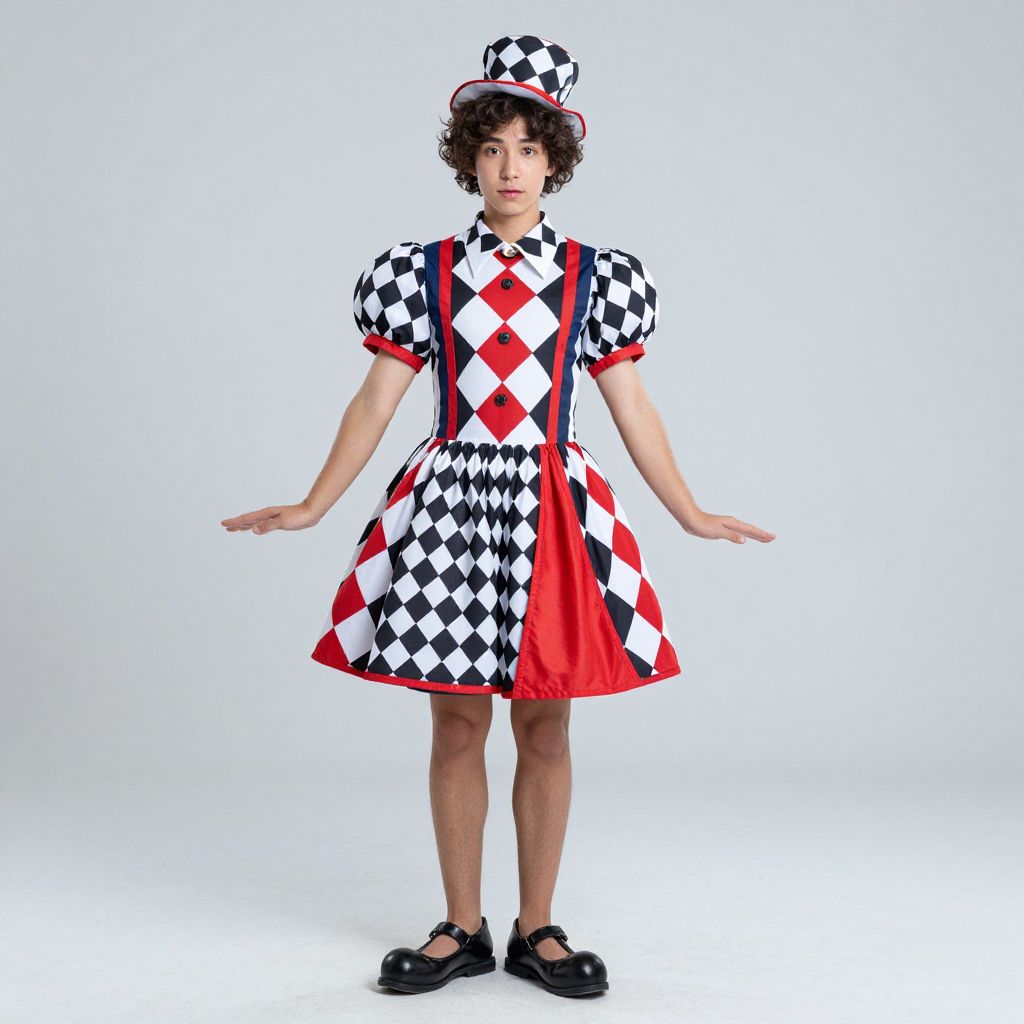 Woman circus costume, solo, hat, crossdressing, checkered clothes, male focus, 1boy, puffy sleeves, full body, standing, dress, skirt, puffy short sleeves, argyle clothes, clown, short sleeves, checkered shirt, cosplay