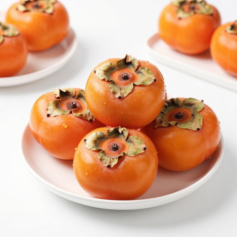 Photograph of seven bright orange cherry tomatoes, each with a small, dark brown stem and dried green calyx, stacked in a triangular pile on a white plate. The tomatoes are glossy with water droplets, and the white background contrasts sharply with their vibrant color. The plate is positioned slightly to the right, with additional tomatoes visible in the blurred background, creating a sense of depth. The image is well-lit with high contrast, emphasizing the tomatoes' texture and freshness.