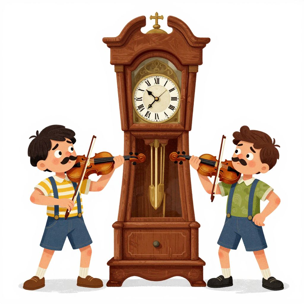 Cartoon illustration of two boys playing violins in front of a tall, wooden grandfather clock with a white clock face.