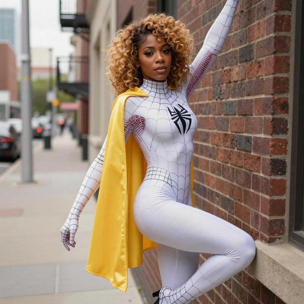 Photograph of a Black woman with curly blonde hair in a white and black spider-web patterned superhero suit, clinging to a brick wall. She has a confident expression, yellow cape, and is positioned above a city street with buildings and cars in the background. Her suit is form-fitting, highlighting her curvy physique.