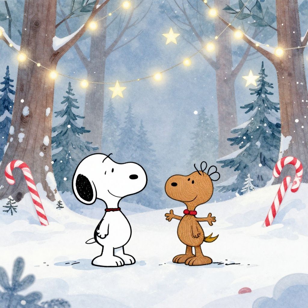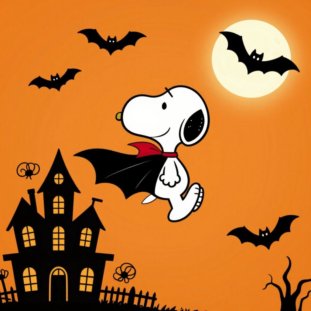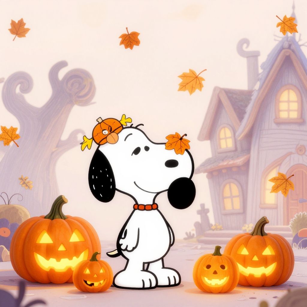 Wallpaper Snoopy Halloween party with Snoopy and Woodstock in cute costumes, jack-o'-lanterns glowing warmly, autumn leaves falling, soft pastel color palette, charming and cheerful style, cartoon background with a spooky old house
