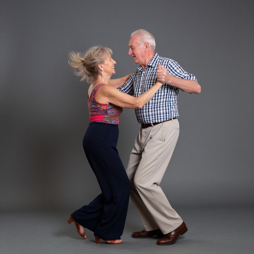 Photograph of an elderly white couple dancing against a gray background. The woman, with short blonde hair, wears a sleeveless red and black floral top and black flared pants, smiling as she gently holds the man's shoulders. The man, with white hair and glasses, wears a black and white checkered shirt and beige pants, looking at her with a smile. They are dancing with a relaxed, joyful posture, and the woman's hair is slightly windswept. The lighting is soft, highlighting their expressions and movements.
