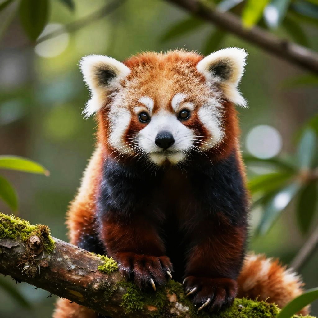 What is the cutest animal ever? A fluffy baby red panda perched on a mossy tree branch, surrounded by soft sunlight filtering through dense forest foliage, vibrant colors, ultra-detailed fur texture, adorable large eyes, high-resolution nature scene.