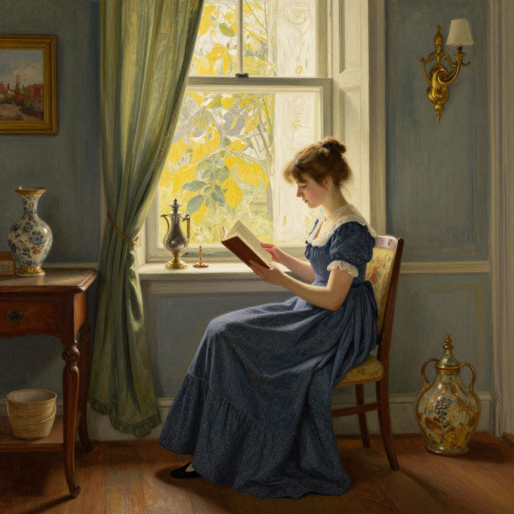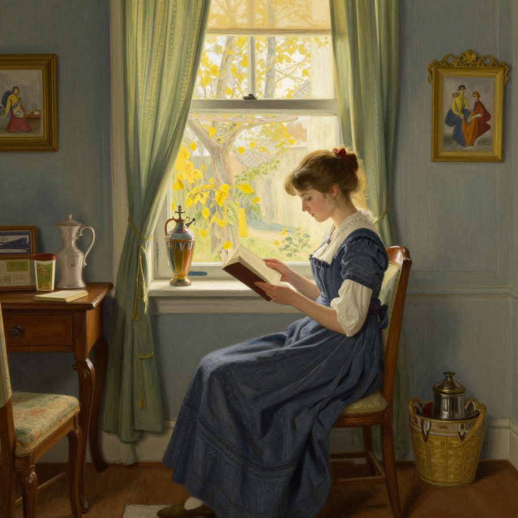 A serene interior scene rendered in a classic, vintage style reminiscent of Carl Larsson, featuring a woman engrossed in reading by a window bathed in soft, golden-hour light, surrounded by detailed furnishings and decorative elements that evoke a timeless, cozy atmosphere.