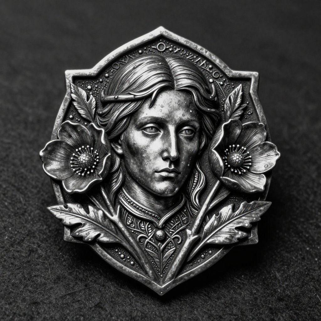 Metal trinket depicting a Hellebore Giovanni Boldini, natural, shimmering, vibrant, gothic, rpg, 1400ad, ultra detailed, detailed, immersive, reminiscent of high fantasy RPG games, HD, masterpiece, best quality, hyper detailed, super realistic, perfect face, perfect hands, award-winning, professional, breathtaking, linquiverabare Buttedry weathermonochrome . black and white, contrast, tone, texture