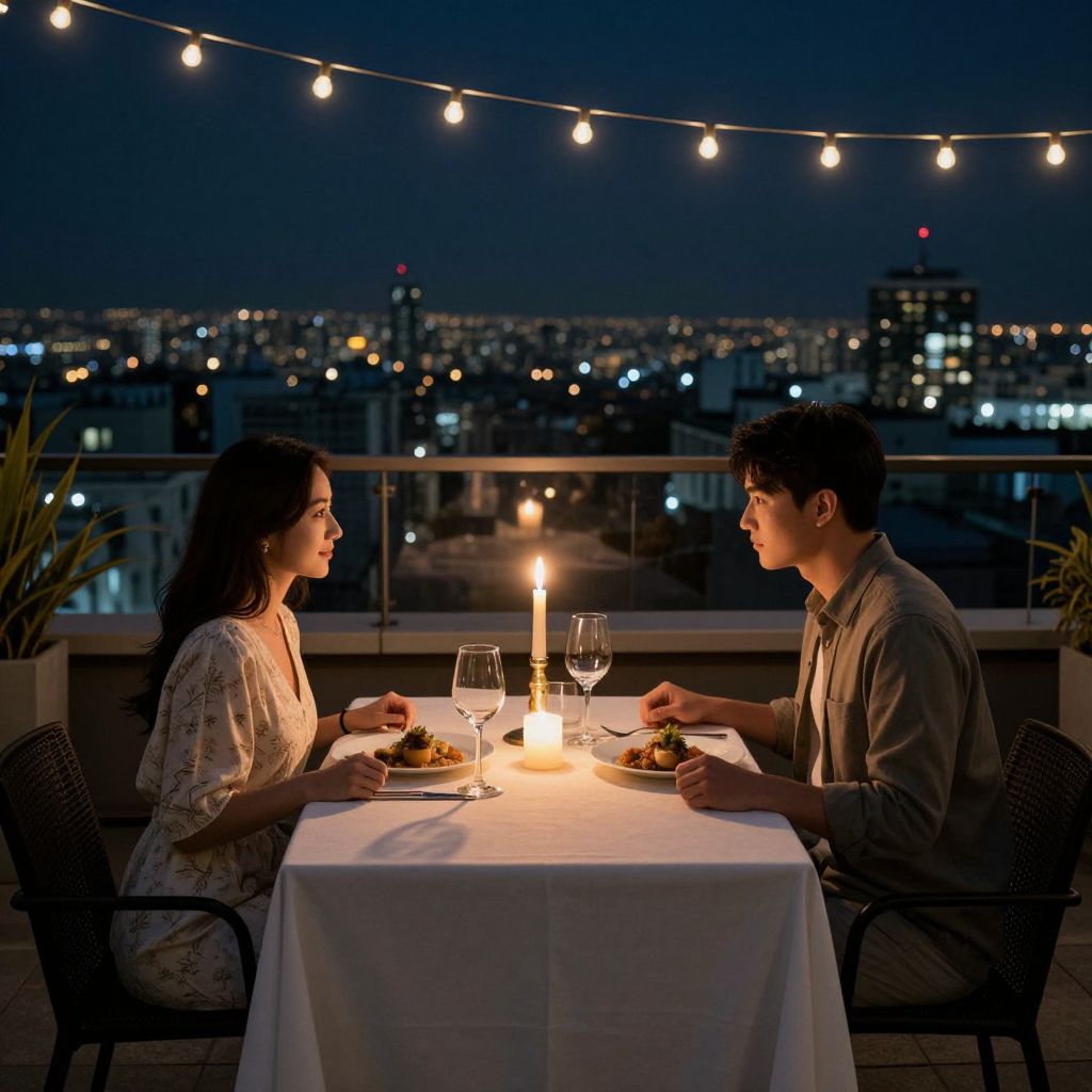 14th anniversary romantic dinner setting on a rooftop terrace at night, candlelight illuminating a table for two with fine dining setup, city lights twinkling in the background, soft string lights overhead, elegant and intimate atmosphere filled with love
