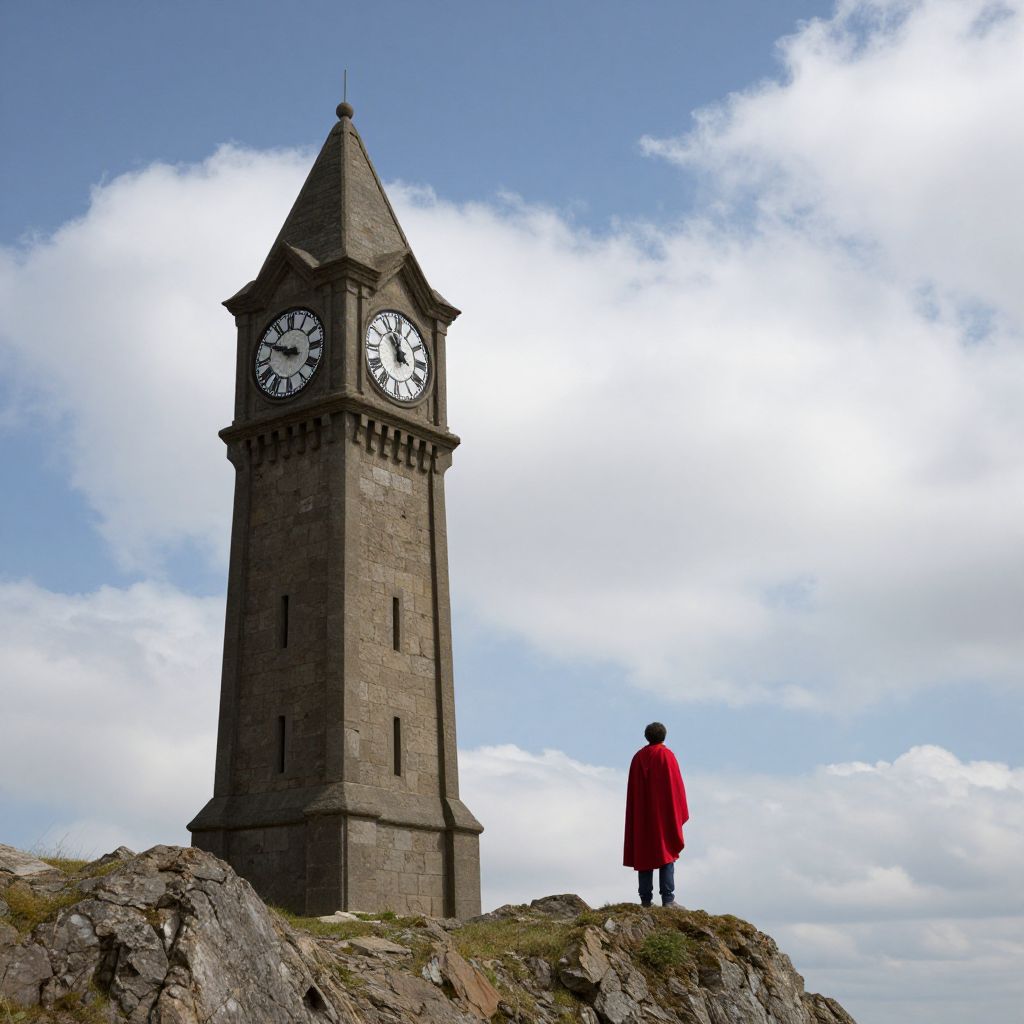 Imposing stone clock tower stands sentinel atop a rocky outcrop, its two Roman numeral clocks facing outward, while a solitary figure draped in a vibrant red cloak gazes toward the horizon beneath a vast expanse of fluffy white clouds.