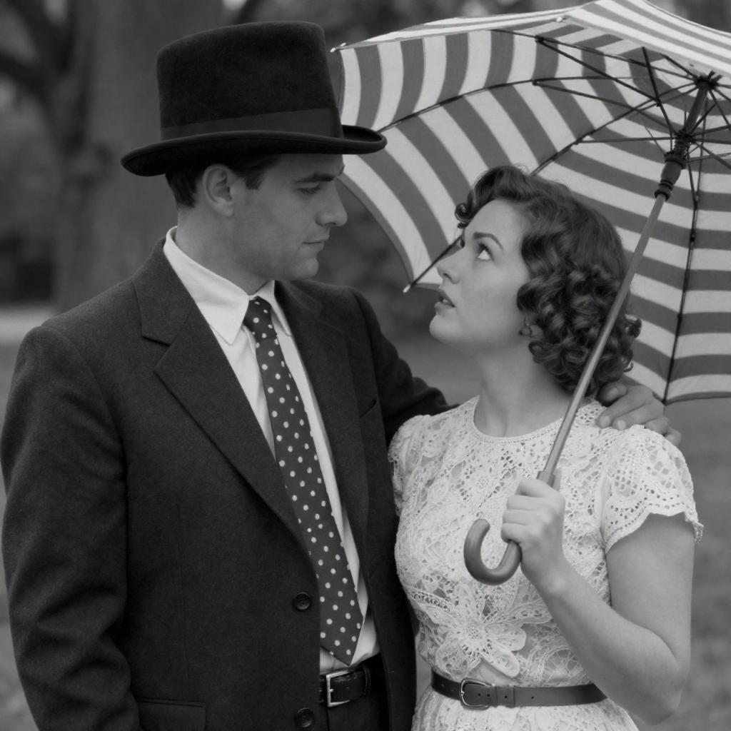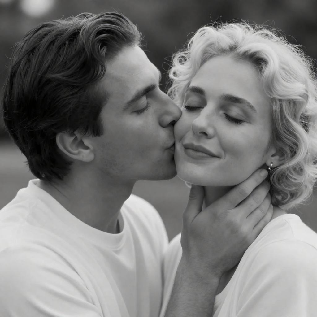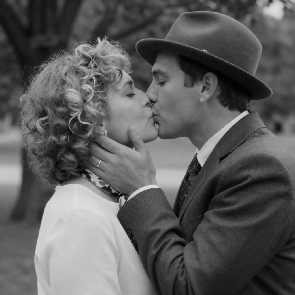 Black-and-white photograph of a man and woman kissing outdoors. Man in fedora, suit, holding woman's face. Woman with curly blonde hair, white blouse, patterned scarf. Both eyes closed. Tree trunk in background, blurred foliage. Man's left hand on woman's neck, right hand on her back. Woman's left hand on man's cheek. Intense, passionate kiss.