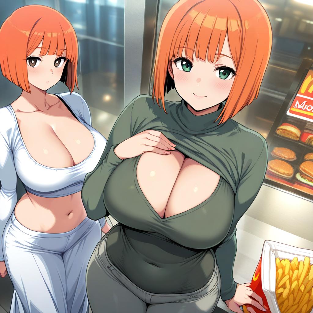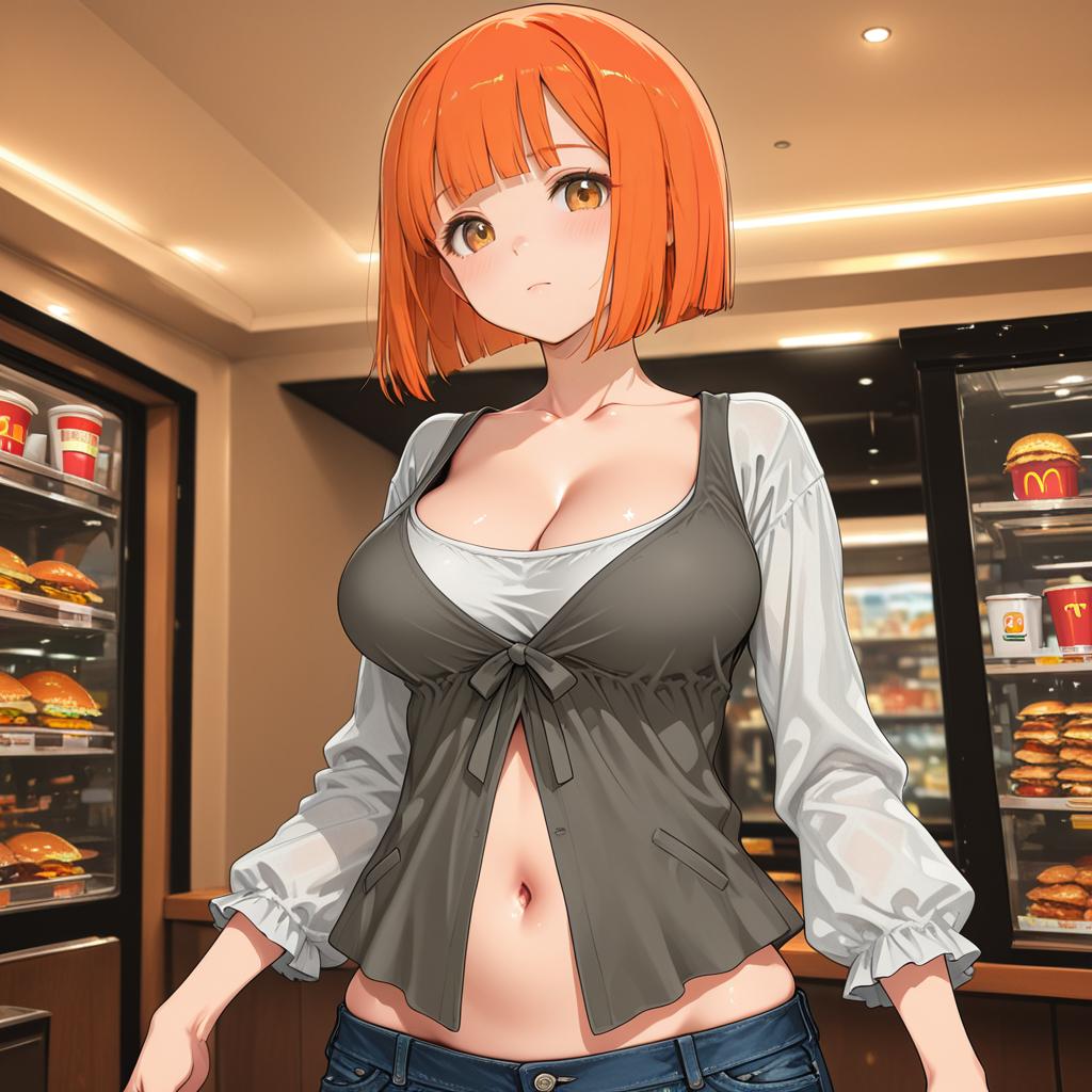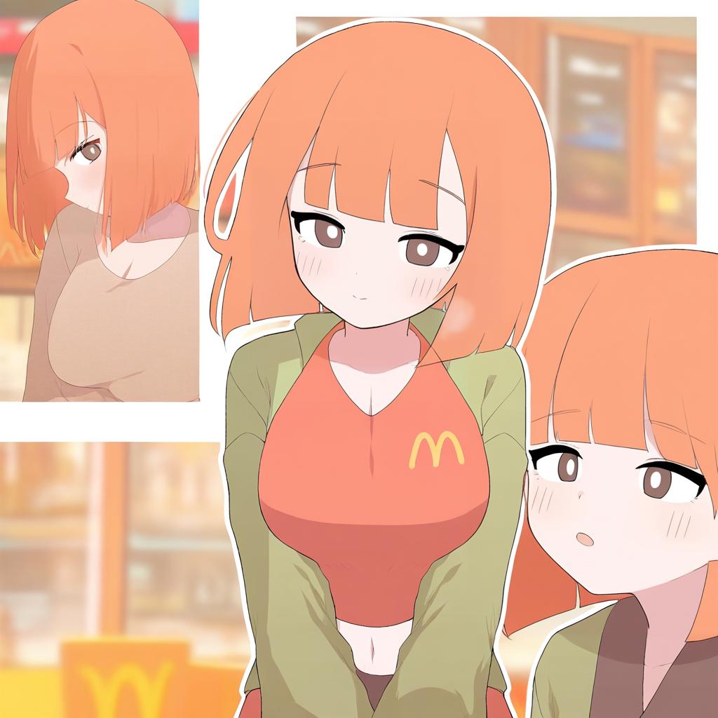 Mother (yoru mac), mcdonald's, 1girl, mature female, brown eyes, black eyes, white pupils, orange hair, short hair, bob cut, blunt bangs, large breasts, cleavage, navel, long sleeves, blunt ends, by artist untue, leet