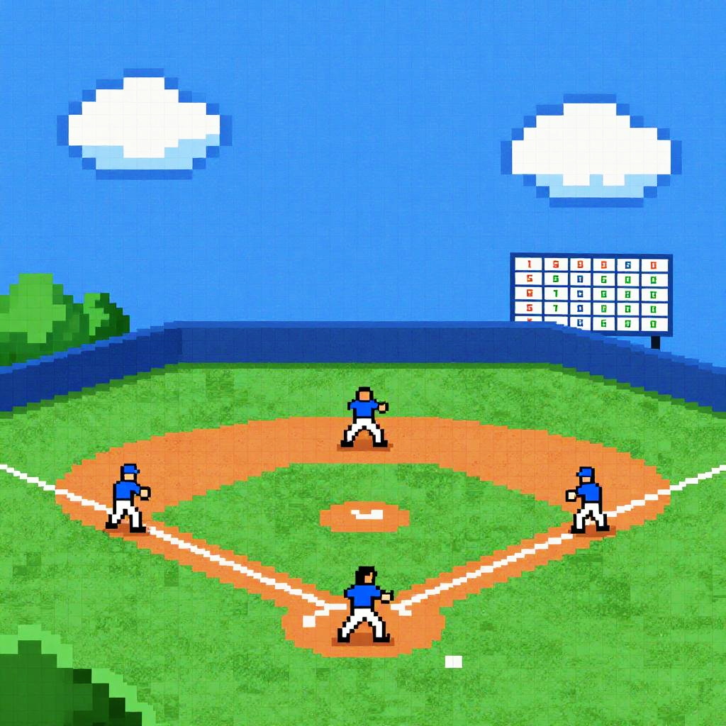 Spreadsheet pixel art baseball scene featuring a classic baseball diamond made entirely out of colorful spreadsheet cells, with pixelated players in vintage uniforms, bright blue sky with blocky clouds, and a scoreboard designed as a grid of spreadsheet data, nostalgic retro gaming style.