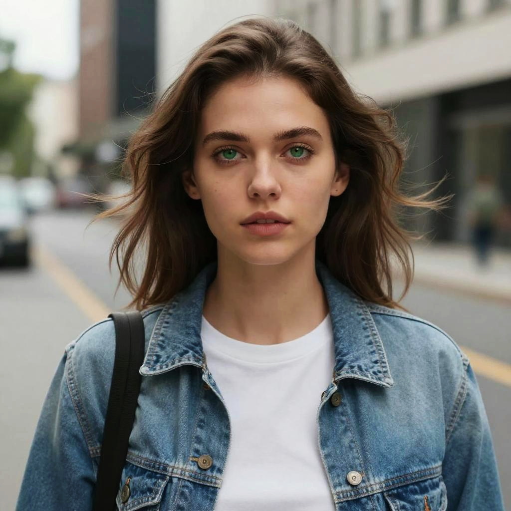 Green eyes brown hair woman in urban setting, casual outfit, wind gently blowing hair, sharp gaze, blend of soft and hard shadows, modern street background, slightly desaturated color palette, focused mood, realistic detail