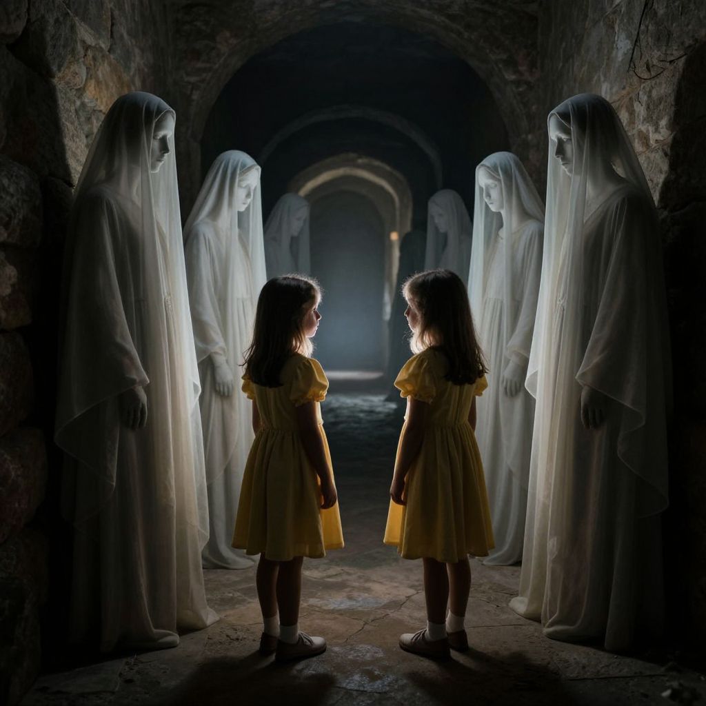In a dimly lit, stone-walled corridor, ethereal figures draped in ghostly veils stand solemnly, their faces etched with sorrowful expressions, while two children in yellow dresses face them, their silhouettes cast dramatically by the eerie glow of a distant light source, creating a haunting tableau where the boundary between the living and the spectral dissolves into a surreal, otherworldly scene.