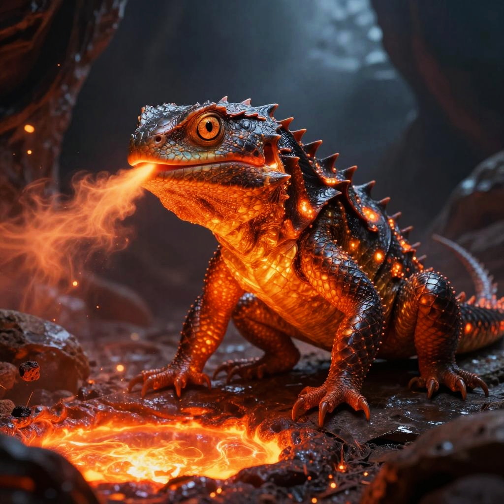 Ember-lizard creature with glowing scales and orange underbelly, crouching low, puffing embers from its nostrils, fire-lit cavern with molten lava pools, action shot, skin pores, very dark lighting, heavy shadows, detailed face, vibrant, photorealistic, dramatic, sharp focus, 8k, (intricate:1.4), decadent, (highly detailed:1.4), digital painting, concept art, octane render, artstation, smooth illustration, global illumination, studio light, volumetric light, atmospheric fog, particles floating, embers, wet surfaces, rim light, depth of field