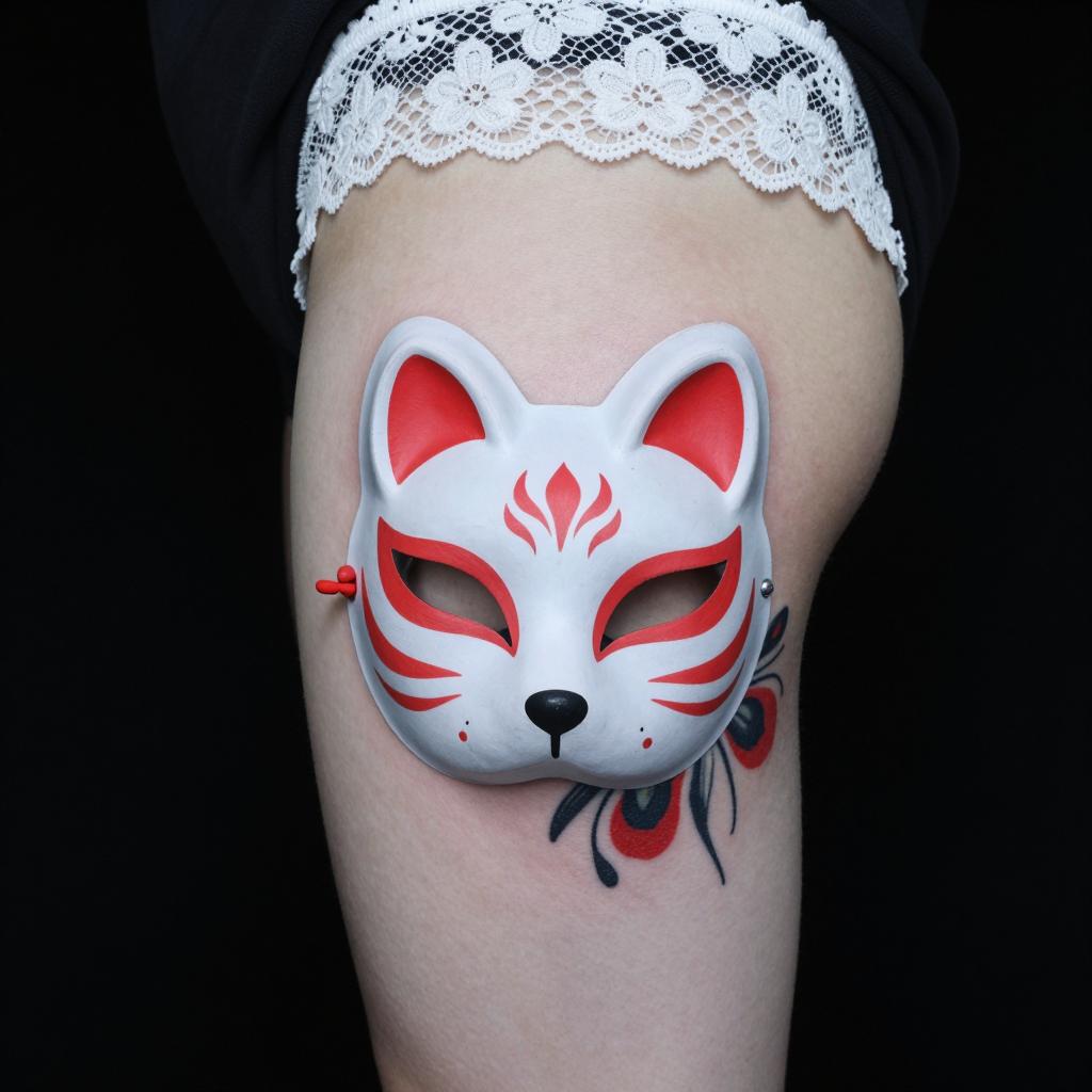 Tattoo on pale skin. A red and gray fox mask with white eyes and red markings on the left, black and red abstract flower on the right. White lace waistband at the top. Black background.