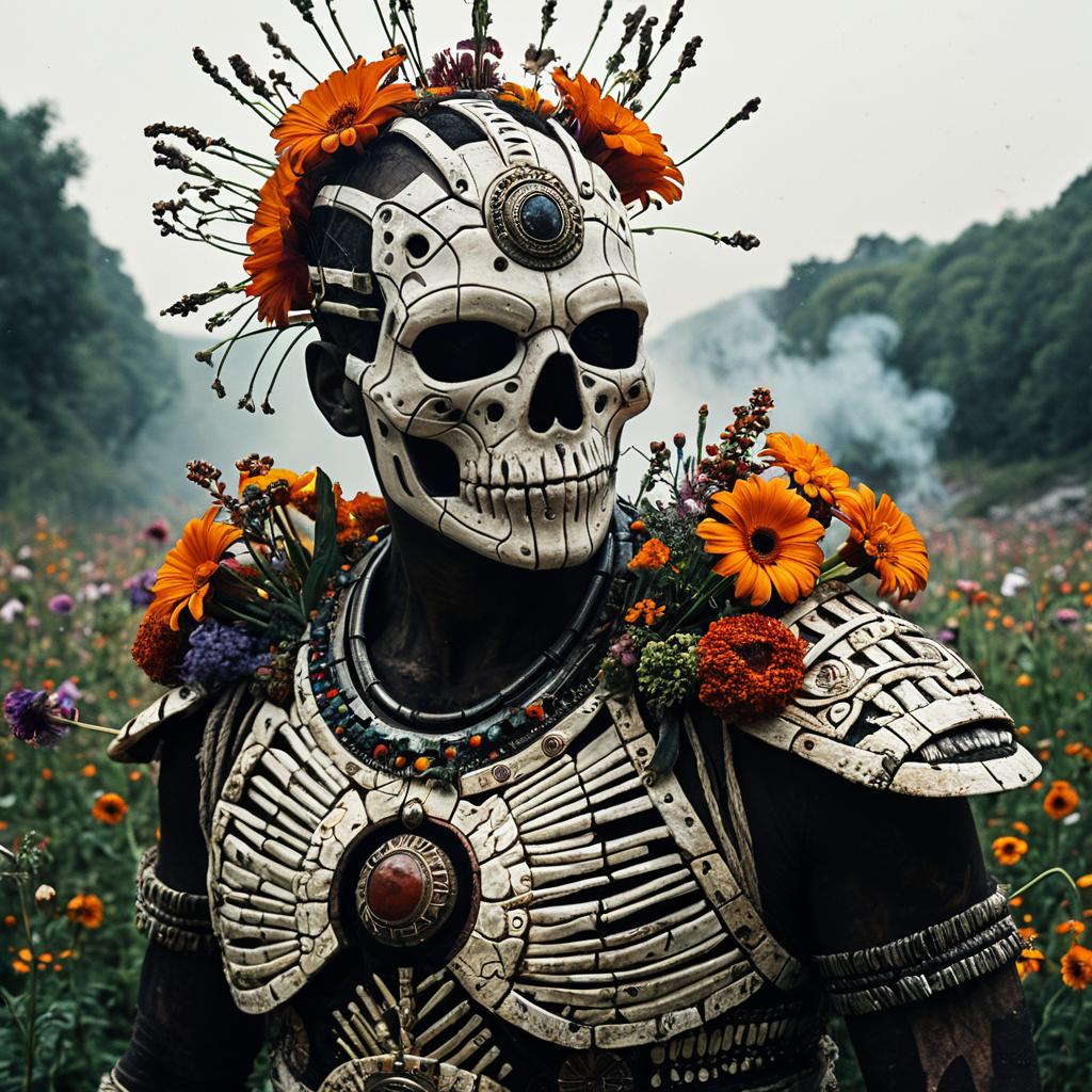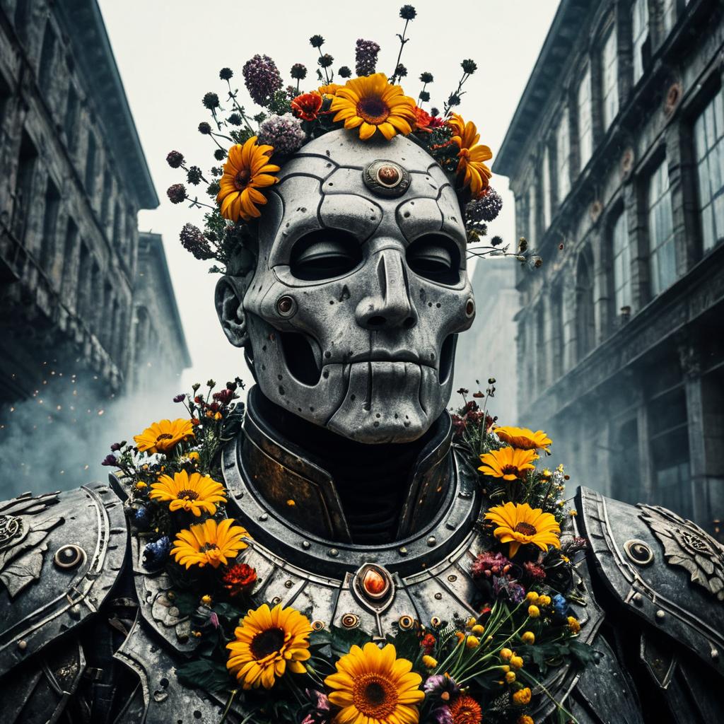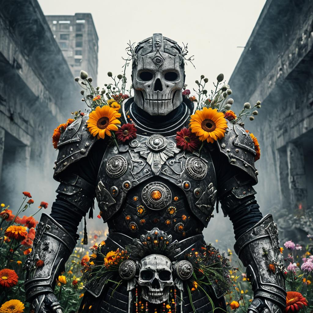 Photorealistic image of a figure wearing brutalist monolithic style armor with a skull-shaped helmet adorned with vibrant flowers. The armor is decorated with a colorful floral garland featuring yellow, orange, and purple blossoms. The background shows a foggy urban setting with architectural structures and a cylindrical building, creating a mysterious and intense atmosphere.