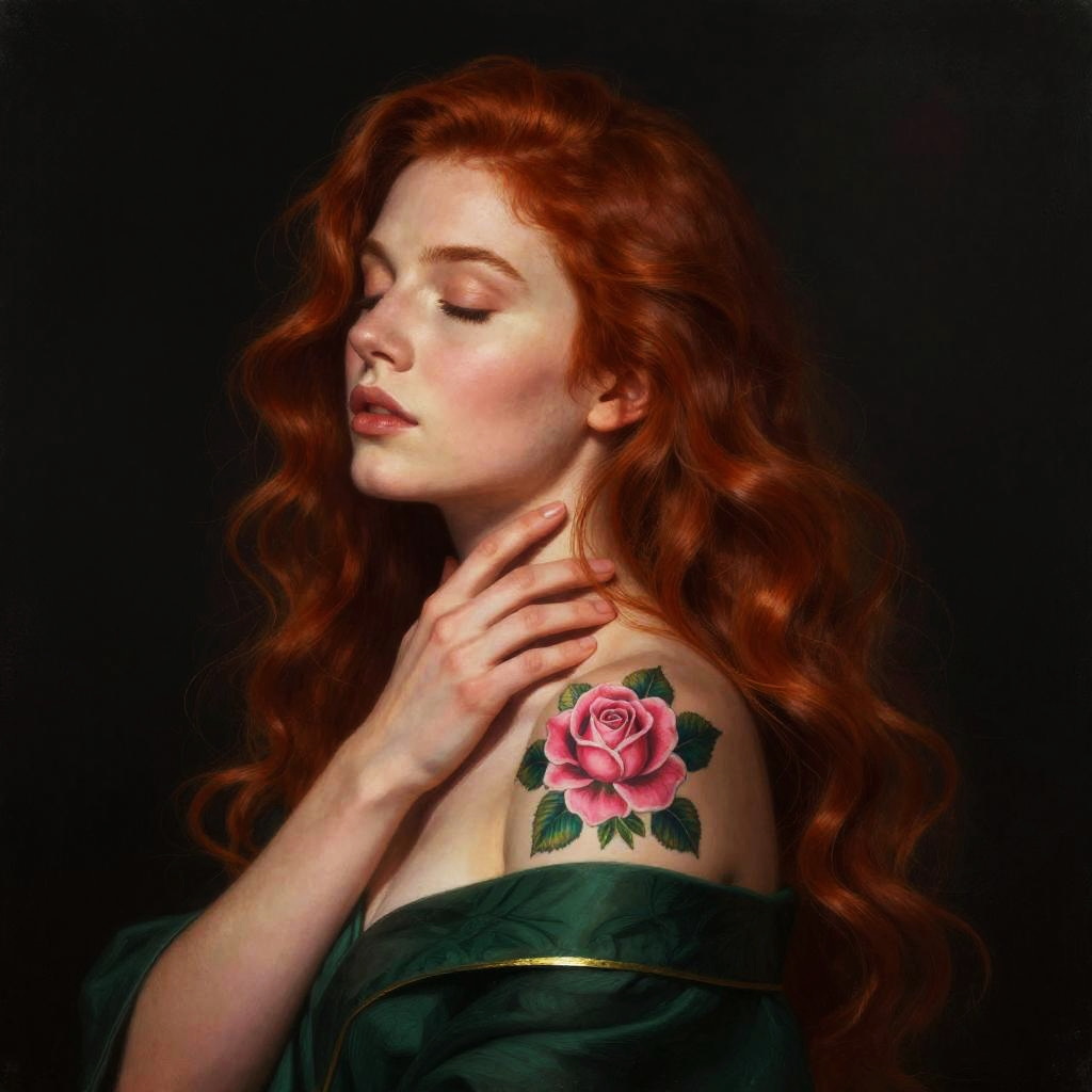 Photorealistic digital painting of a fair-skinned woman with long, wavy red hair. She's gently touching her neck, eyes closed, wearing a dark green, off-shoulder garment with a gold band. Her right shoulder features a vivid, pink rose tattoo with green leaves. The background is a deep black, making her red hair and the tattoo pop. She looks ethereal and serene.