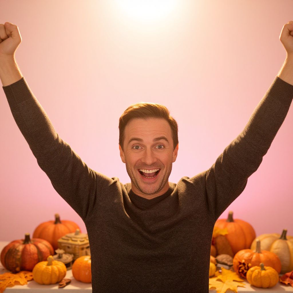 Intimate portrait: A man, dressed in casual attire, stands amidst a sea of vibrant autumn leaves, symbolizing gratitude and abundance on Thanksgiving Day. Shoulder-level shot captures his genuine smile as he holds a plate filled with seasonal delicacies, surrounded by golden hues, rustic wooden table, soft candlelight, cozy fireplace, inviting atmosphere, warm tones, Man has masculine face and piercing eyes