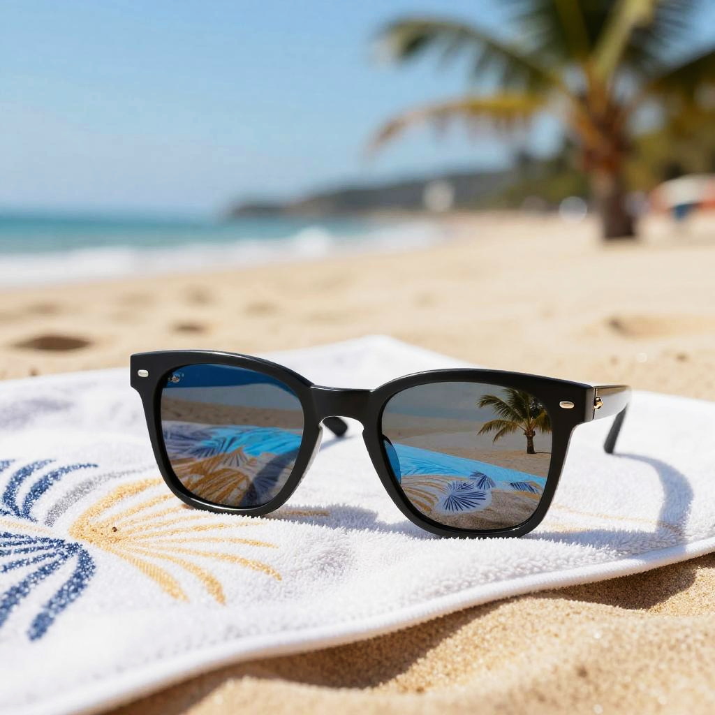 Photograph of retro-style round sunglasses with black frames, gold accents, and reflective lenses featuring a tropical beach scene with palm trees and ocean waves.