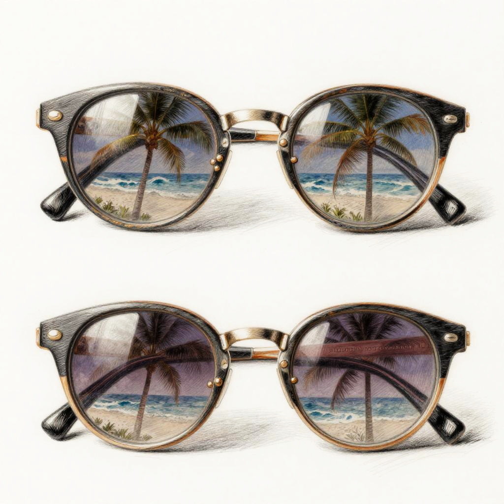 Sunglasses drawing featuring retro round frames, sketched with pencil and charcoal textures, soft shading and crosshatching, vintage summer vibe, realistic reflections on the lenses depicting palm trees and ocean waves, artistic and elegant composition.