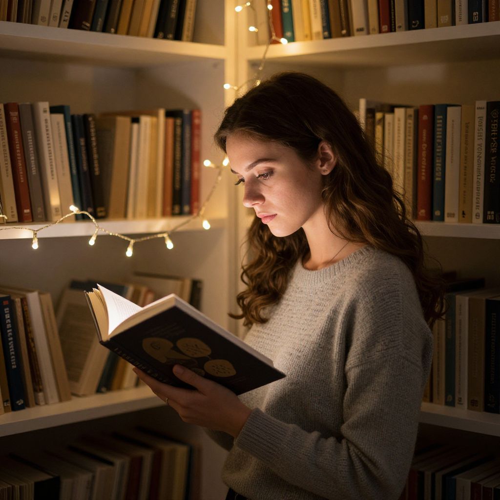 Sunlit blonde woman engrossed in reading an open book amidst vibrant red tulips, with shelves of colorful books softly blurred in the background.