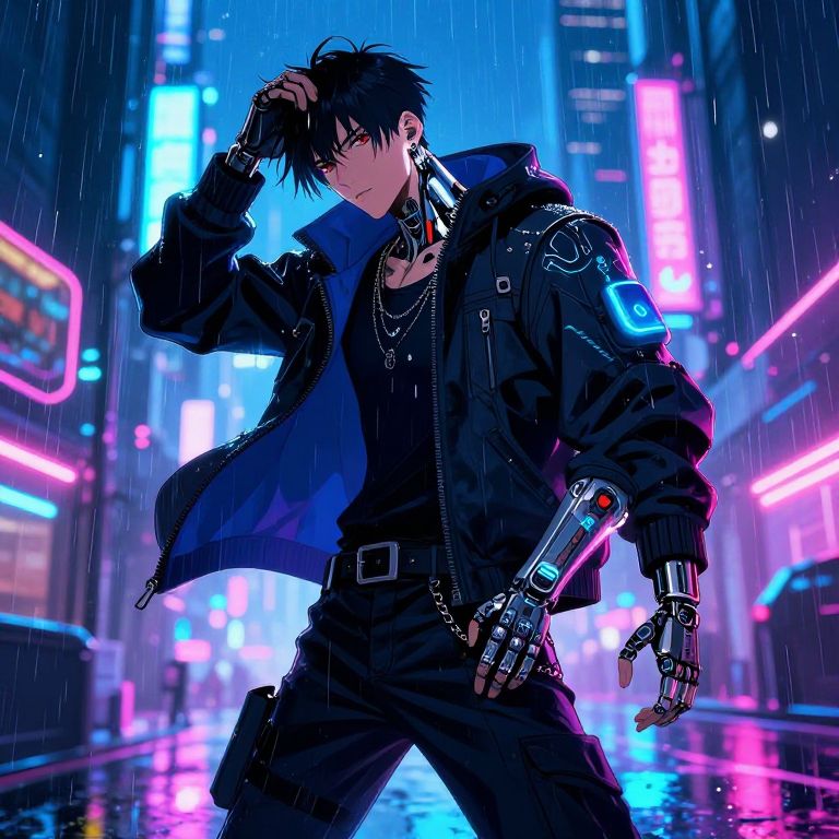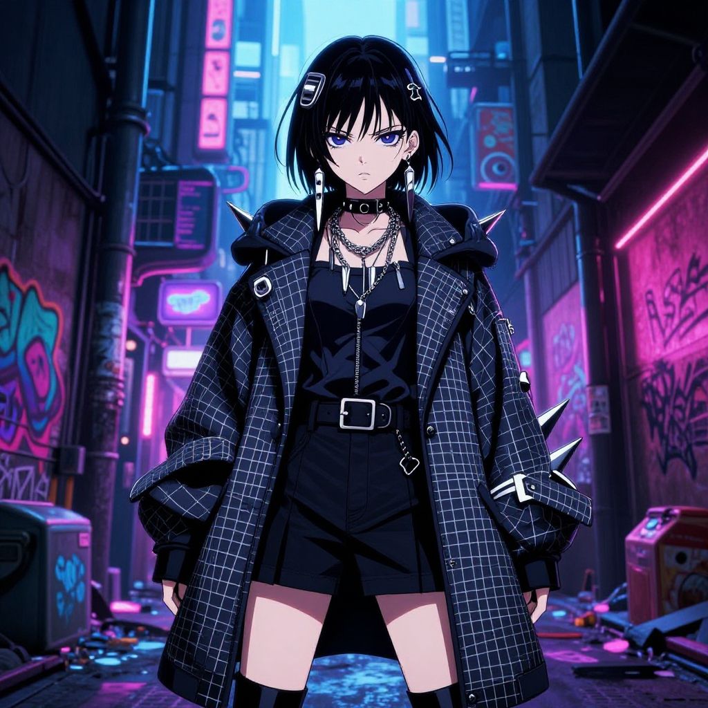 Jirai kei anime character design, edgy young woman with sharp accessories, oversized coat and grid patterns, surreal city alley with glowing graffiti, intense atmosphere