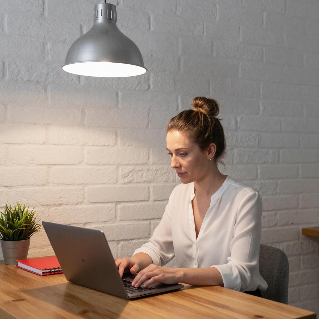 A photograph of a woman with light brown hair in a bun, wearing a white blouse, sitting at a wooden desk, focused on a silver laptop. She's against a white brick wall with a metal pendant lamp overhead. A small potted plant and red folder are on the desk to her left. The lighting creates a soft shadow on the wall.