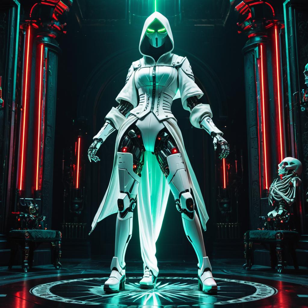Full-body depiction of a pale humanoid ninja robot goddess statue in a baroque and Blade Runner-inspired setting. The figure features a white ceramic body with a street-style hoody, glowing green eyes beneath a hood, and intricate futuristic mechanical details. Background includes neon teal and red lights, human skulls, and a throne made of bones, blending elements of steampunk and hyper-realistic 3D art.