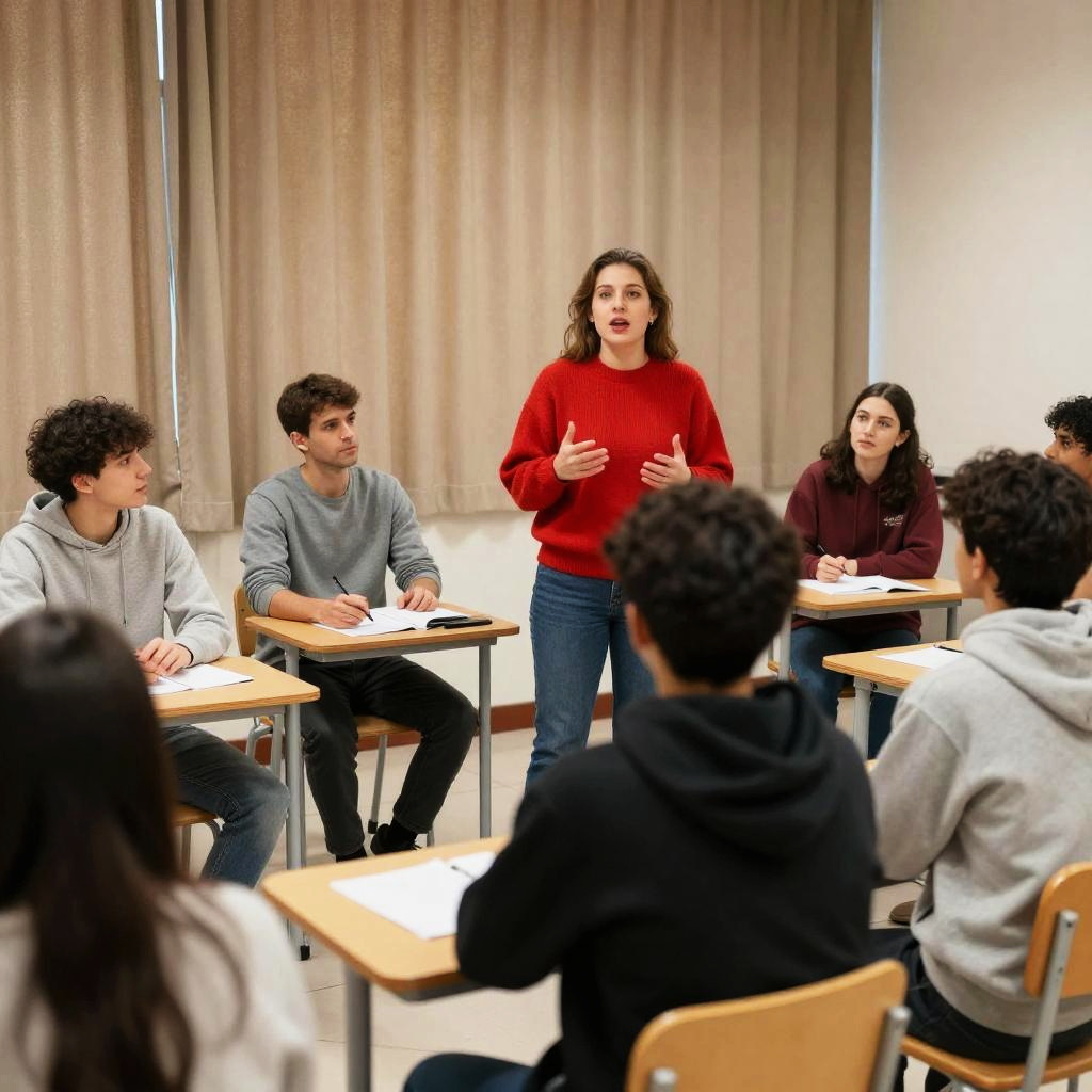 A diverse group of people engaged in a serious discussion in a classroom setting, woman in red sweater standing and speaking while others seated attentively, natural warm indoor lighting, casual clothing, school chairs and desks, neutral beige curtains in the background