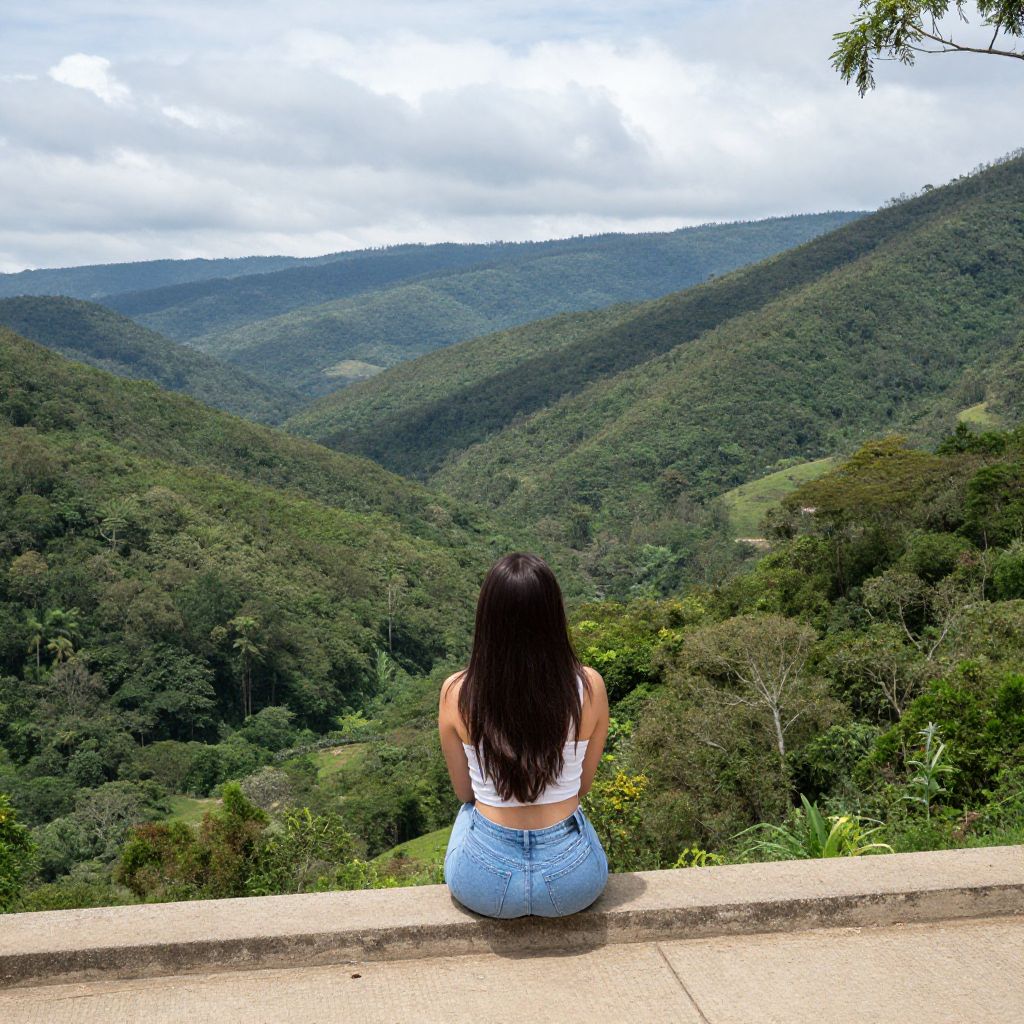 Woman sitting atop a concrete ledge, gazing out over a lush, verdant valley in Colombia, surrounded by dense green forests and distant mountains under a partly cloudy sky.